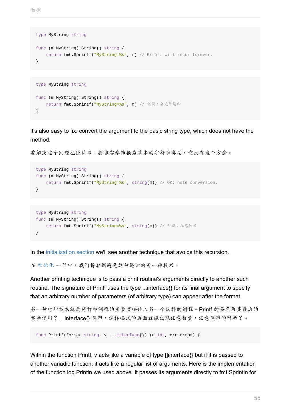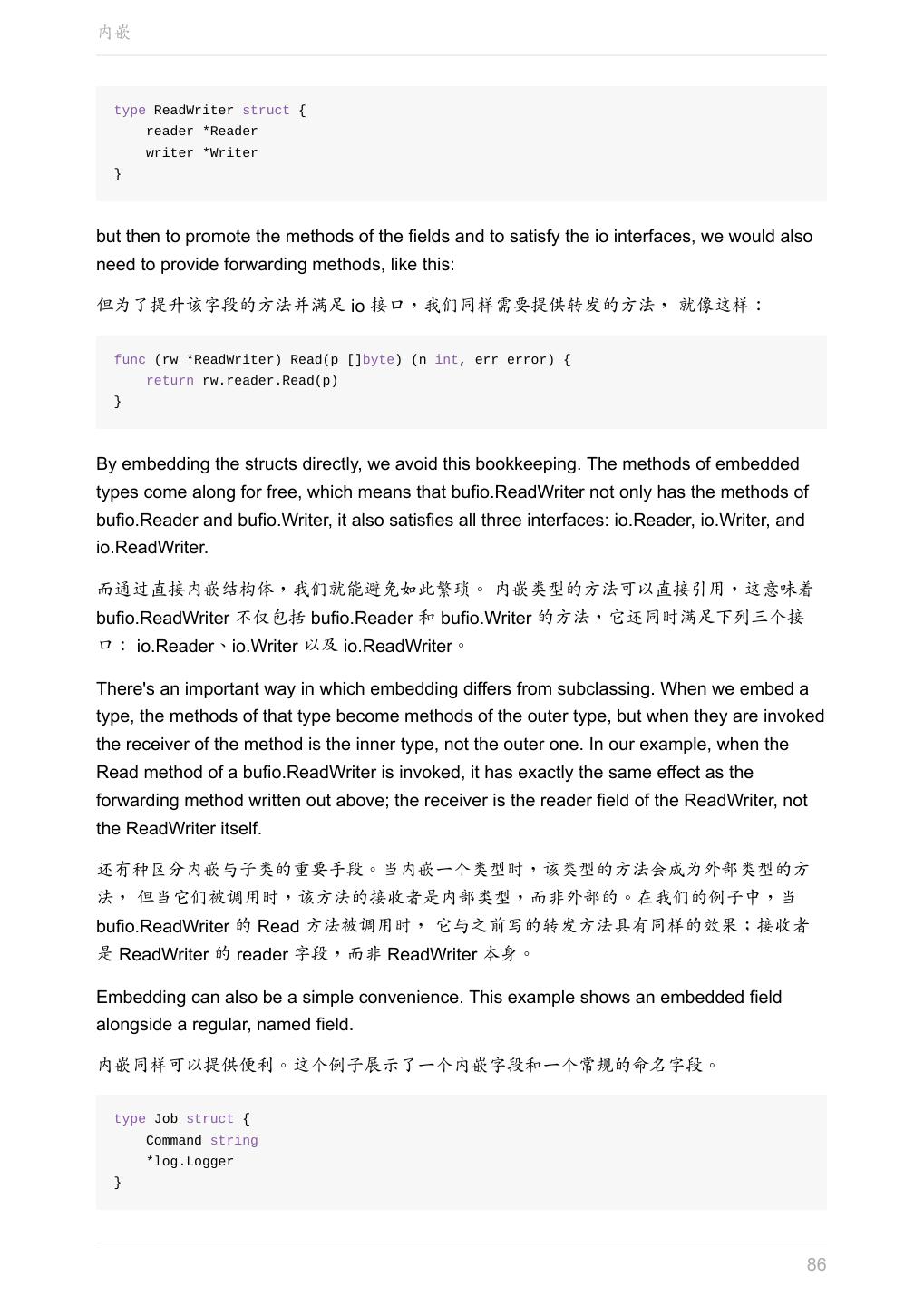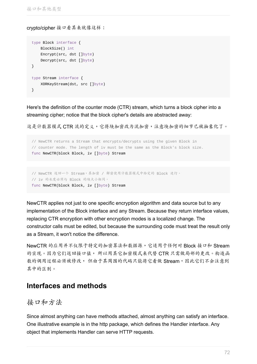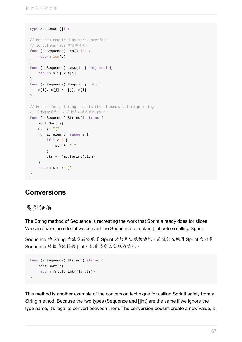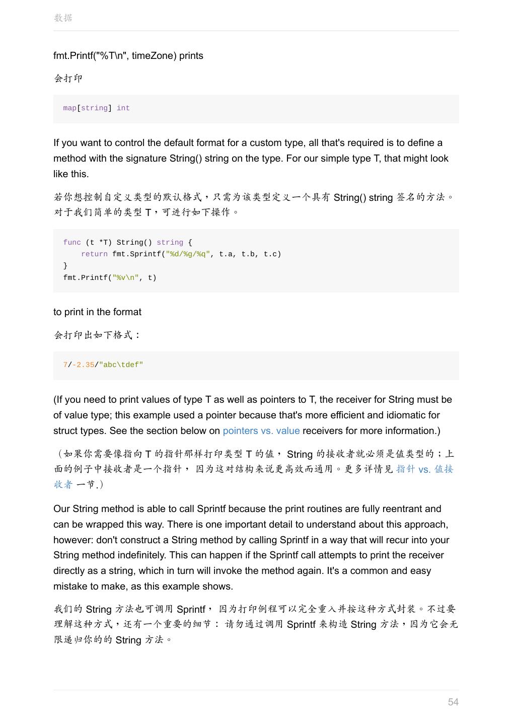 18 .命名 获取器 Go doesn't provide automatic support for getters and setters. There's nothing wrong with providing getters and setters yourself, and it's often appropriate to do so, but it's neither idiomatic nor necessary to put Get into the getter's name. If you have a field called owner (lower case, unexported), the getter method should be called Owner (upper case, exported), not GetOwner. The use of upper-case names for export provides the hook to discriminate the field from the method. A setter function, if needed, will likely be called SetOwner. Both names read well in practice: Go 并不对获取器(getter)和设置器(setter)提供自动支持。 你应当自己提供获取器和设 置器,通常很值得这样做,但若要将 Get 放到获取器的名字中,既不符合习惯,也没有必 要。若你有个名为 owner (小写,未导出)的字段,其获取器应当名为 Owner(大写,可导 出)而非 GetOwner。大写字母即为可导出的这种规定为区分方法和字段提供了便利。 若要 提供设置器方法,SetOwner 是个不错的选择。两个命名看起来都很合理: owner := obj.Owner() if owner != user { obj.SetOwner(user) } Interface names 接口名 By convention, one-method interfaces are named by the method name plus an -er suffix or similar modification to construct an agent noun: Reader, Writer, Formatter, CloseNotifier etc. 按照约定,只包含一个方法的接口应当以该方法的名称加上 - er 后缀来命名,如 Reader、 Writer、 Formatter、CloseNotifier 等。 There are a number of such names and it's productive to honor them and the function names they capture. Read, Write, Close, Flush, String and so on have canonical signatures and meanings. To avoid confusion, don't give your method one of those names unless it has the same signature and meaning. Conversely, if your type implements a method with the same meaning as a method on a well-known type, give it the same name and signature; call your string-converter method String not ToString. 诸如此类的命名有很多,遵循它们及其代表的函数名会让事情变得简单。 Read、Write、 Close、Flush、 String 等都具有典型的签名和意义。为避免冲突,请不要用这些名称为你的 方法命名, 除非你明确知道它们的签名和意义相同。反之,若你的类型实现了的方法, 与一 个众所周知的类型的方法拥有相同的含义,那就使用相同的命名。 请将字符串转换方法命名 为 String 而非 ToString。 18