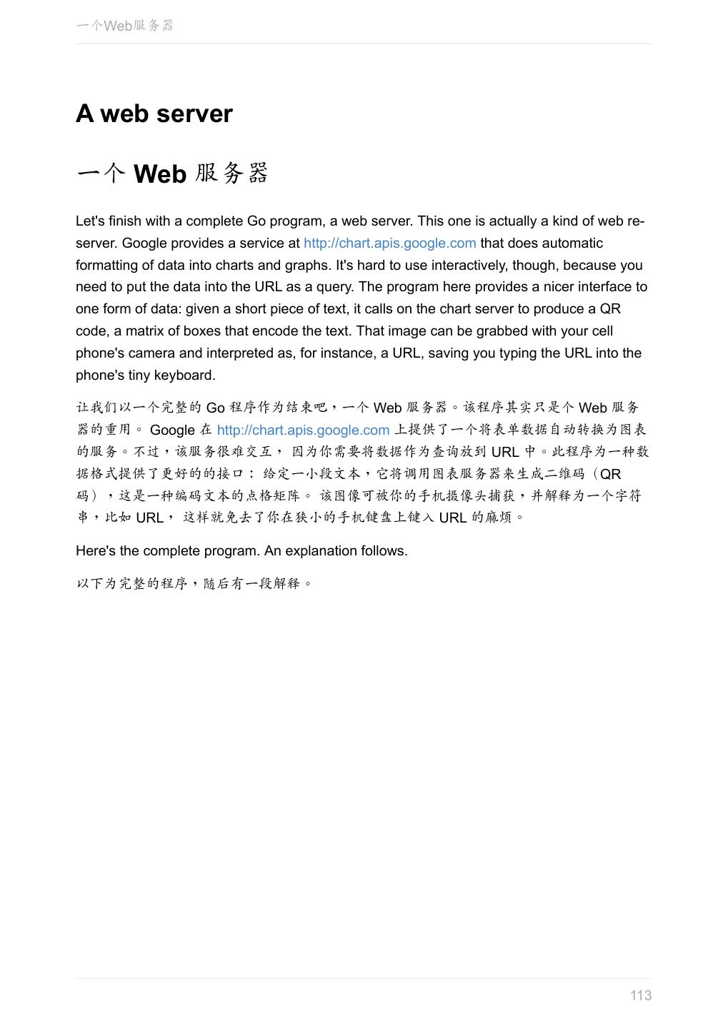 4 .前言 2. 引言 3. 格式化 4. 注释 5. 命名 6. 分号 7. 控制结构 8. 函数 9. 数据 10. 初始化 11. 方法 12. 接口和其他类型 13. 空白标识符 14. 内嵌 15. 并发 16. 错误 17. 一个 Web 服务器 改版说明:@2016.8.6 by bingoHuang, revision to Chinese & English version. 李笑来在他的新书 《人人都是工程师》 中说过一句话: 在中国,对绝大多数人来 说, English + Computer Skills = Freedom (英语 + 计算机技能 = 自由) 我非常的赞同。英语和计算机技能是相辅相成,学习好一门编程语言(如 Go )的同 时,还能加强英语学习,何乐而不为。所以我决定将本书改版成中英双语版,方便更多 的人来学习阅读。 特别感谢 Golang 官网提供的英文版教程。 感谢 hellogcc 提供的 中文翻译版一,这是我之前制作中文版电子书所参考的资料,翻译 的很用心。 要更感谢 Go 语言中文社区 提供的 中文翻译版二,此翻译更贴切有味道,不可多得。本 人已和 Go-zh 项目组 沟通过,获取了该社区的授权,故将此作为双语版的中文版本。 参考 参考官方英文版:Effective Go 英文版 参考中文翻译版一:Effective Go 中文版 参考中文翻译版二:Effective Go 中文版 Read, Fork and Star 4