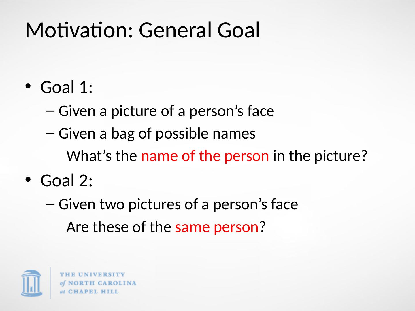 4 .Motivation: General Goal Goal 1: Given a picture of a person’s face Given a bag of possible names What’s the name of the person in the picture? Goal 2: Given two pictures of a person’s face Are these of the same person ?