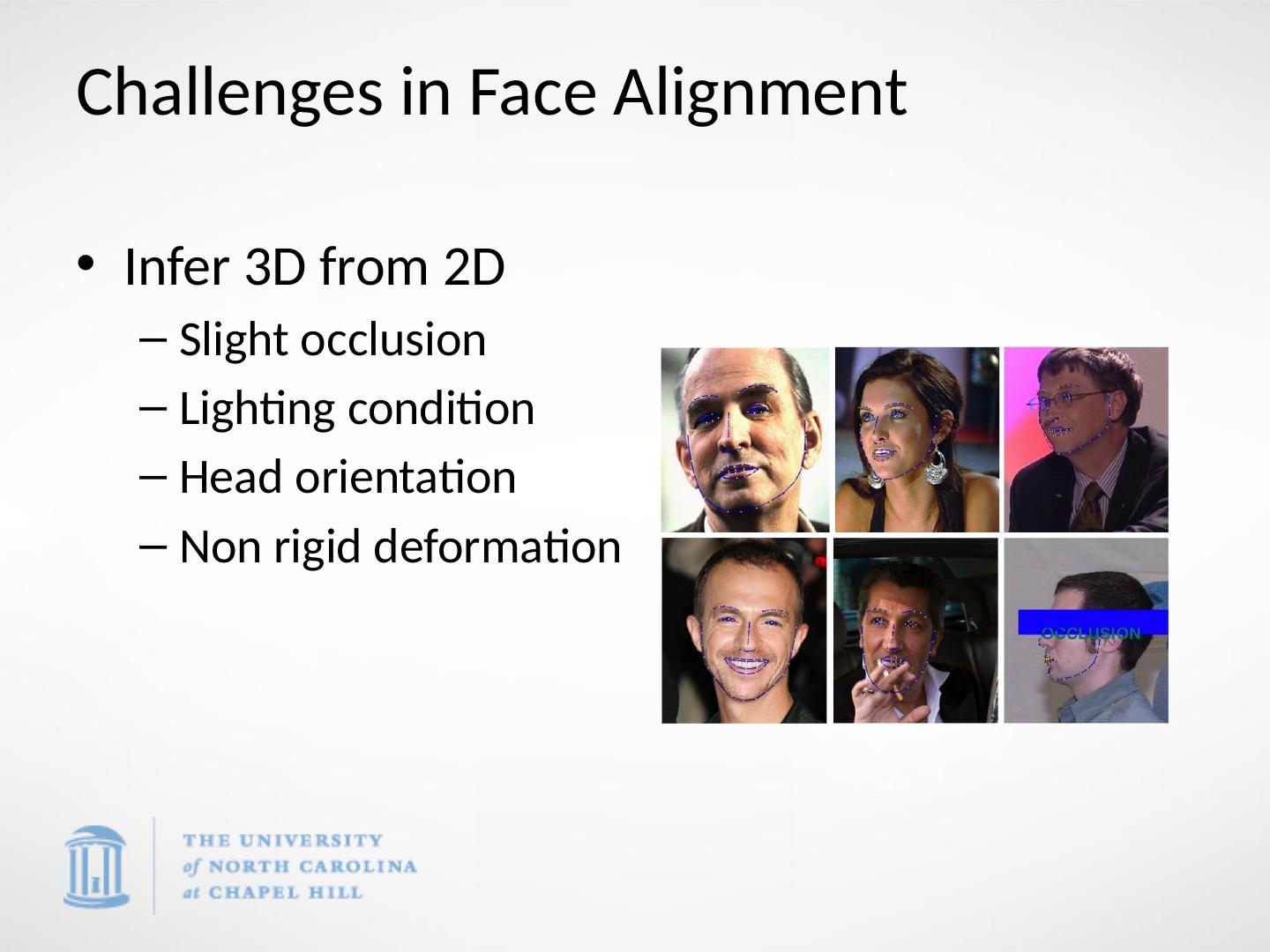 9 .Challenges in Face Alignment Infer 3D from 2D Slight occlusion Lighting condition Head orientation Non rigid deformation