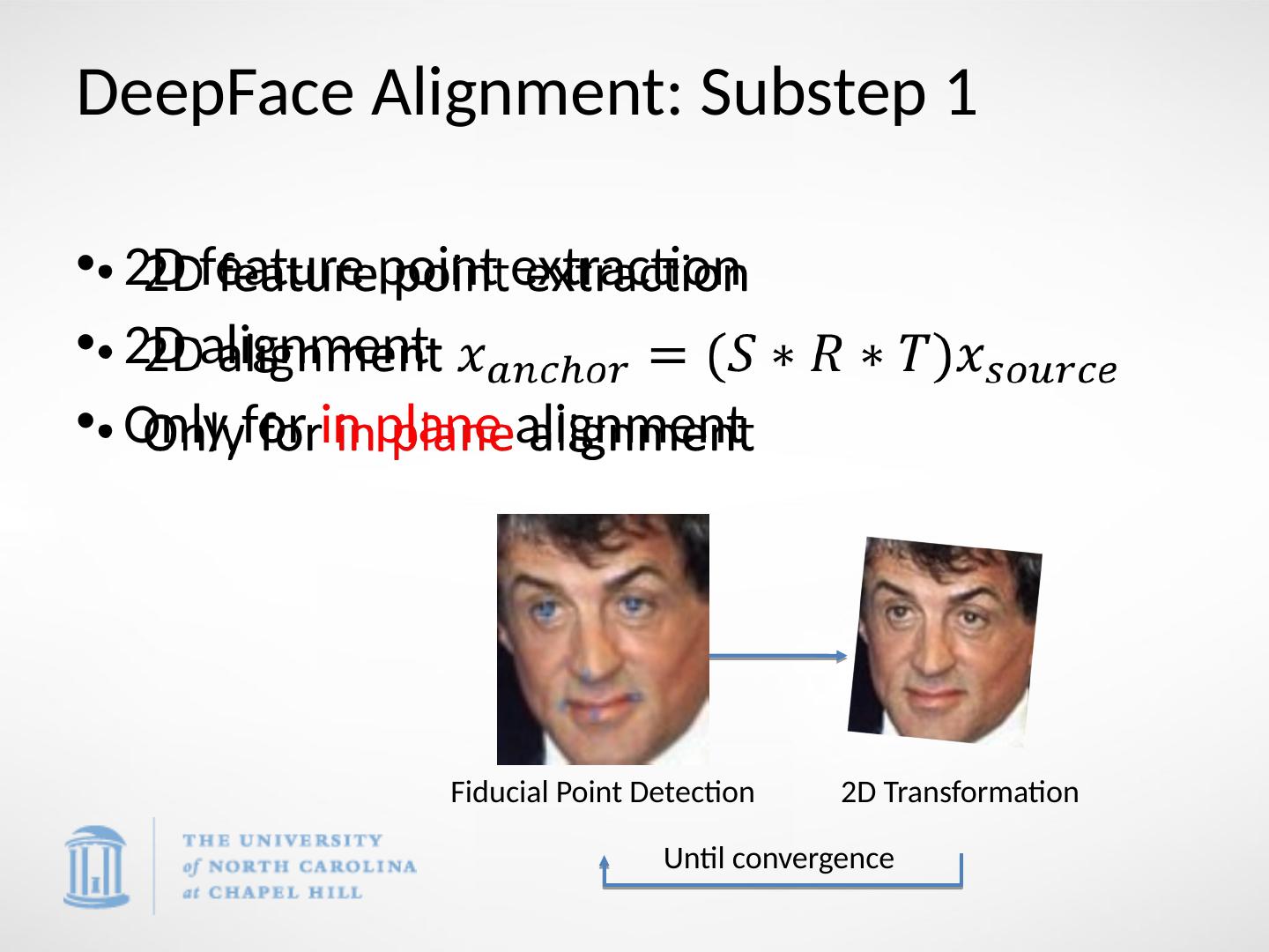 10 .DeepFace Alignment: Substep 1 2D feature point extraction 2D alignment Only for in plane alignment Fiducial Point Detection 2D Transformation Until convergence