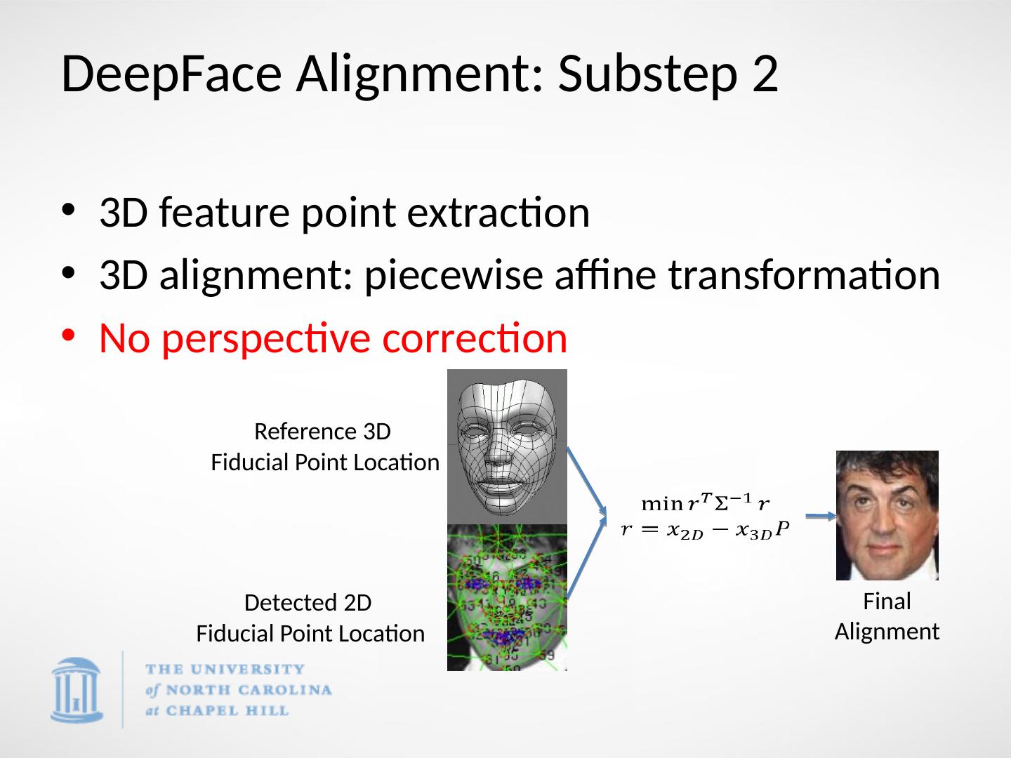 11 .DeepFace Alignment: Substep 2 3D feature point extraction 3D alignment: piecewise affine transformation No perspective correction Reference 3D Fiducial Point Location Detected 2D Fiducial Point Location Final Alignment