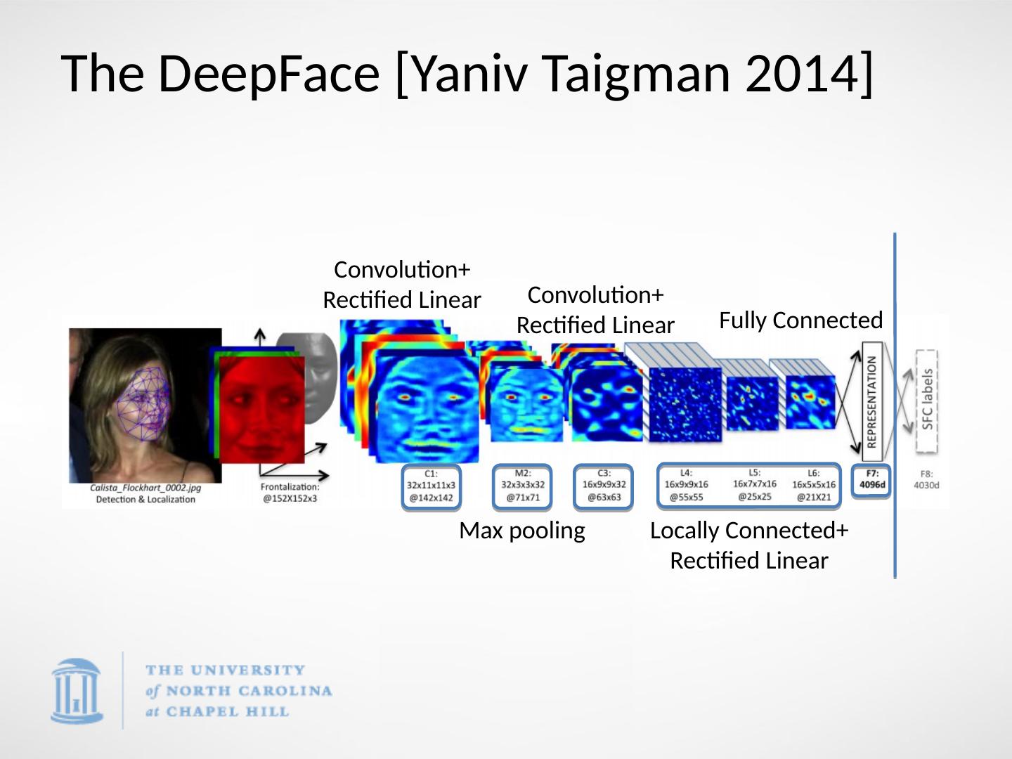 16 .The DeepFace [ Yaniv Taigman 2014] Convolution+ Rectified Linear Max pooling Convolution+ Rectified Linear Locally Connected+ Rectified Linear Fully Connected