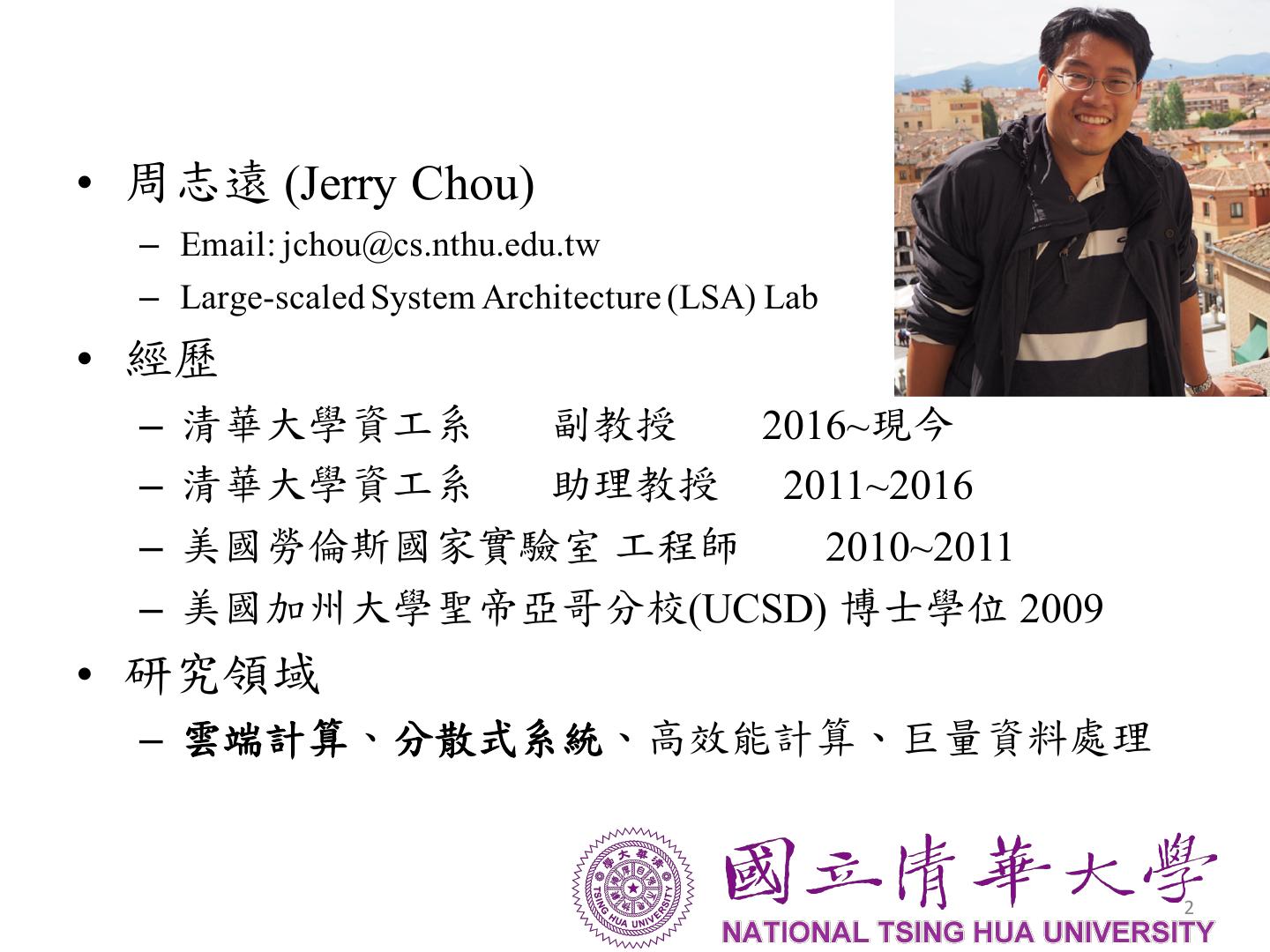 2 .• 周志遠 (Jerry Chou) – Email: jchou@cs.nthu.edu.tw – Large-scaled System Architecture (LSA) Lab • 經歷 – 清華大學資工系 副教授 2016~現今 – 清華大學資工系 助理教授 2011~2016 – 美國勞倫斯國家實驗室 工程師 2010~2011 – 美國加州大學聖帝亞哥分校(UCSD) 博士學位 2009 • 研究領域 – 雲端計算、分散式系統、高效能計算、巨量資料處理 2