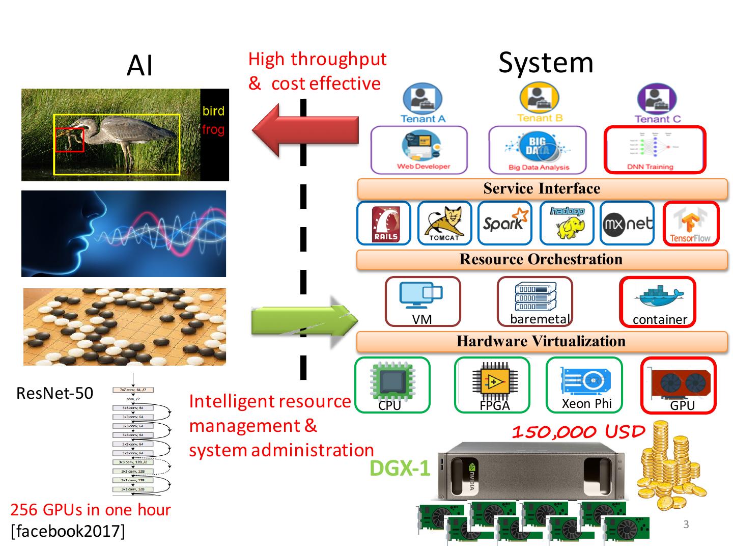 3 . AI High throughput System & cost effective Service Interface Resource Orchestration VM baremetal container Hardware Virtualization ResNet-50 Intelligent resource CPU Xeon Phi FPGA GPU management & 150,000 USD system administration DGX-1 256 GPUs in one hour 3 [facebook2017]