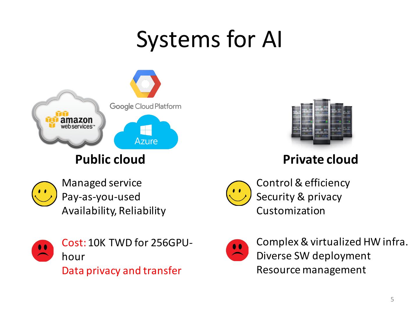 4 . Systems for AI Public cloud Managed service Pay-as-you-used Availability, Reliability Cost: 10K TWD for 256GPU- hour Data privacy and transfer 4