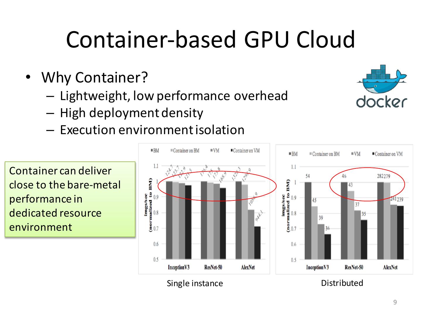 8 . Container-based GPU Cloud • Why Container? – Lightweight, low performance overhead – High deployment density – Execution environment isolation Benchmark TensorFlow on varied resource orchestration (baremetal, container, VM) and execution environment (single, distributed, multi-tenant) 8