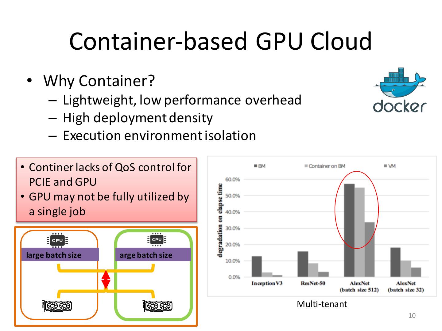 9 . Container-based GPU Cloud • Why Container? – Lightweight, low performance overhead – High deployment density – Execution environment isolation Container can deliver close to the bare-metal performance in dedicated resource environment Single instance Distributed 9