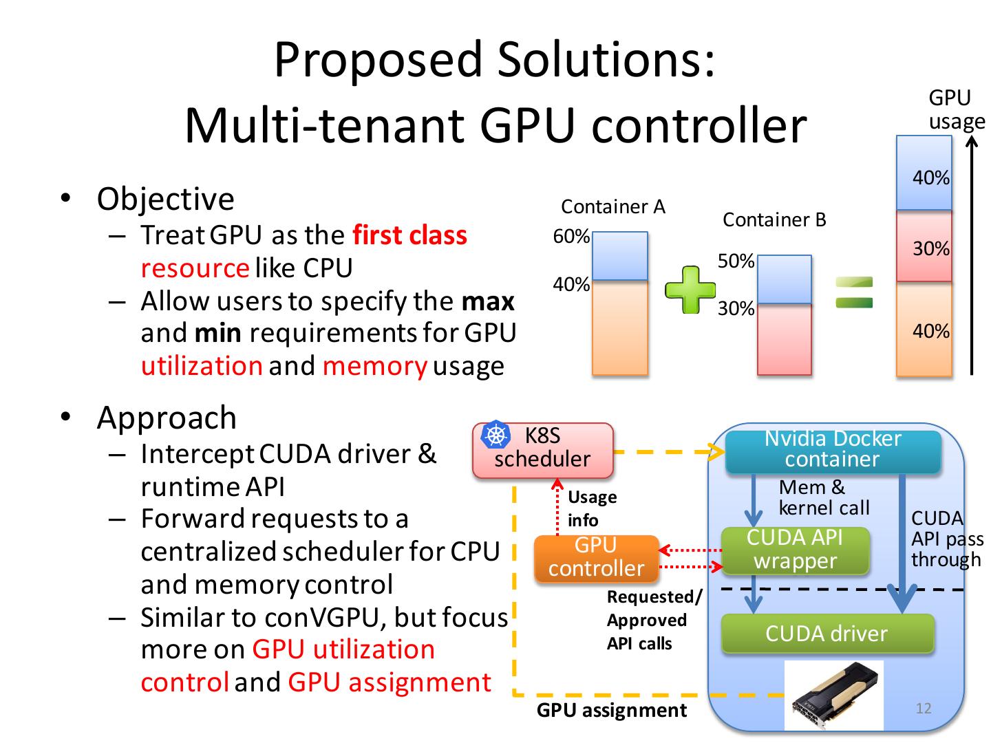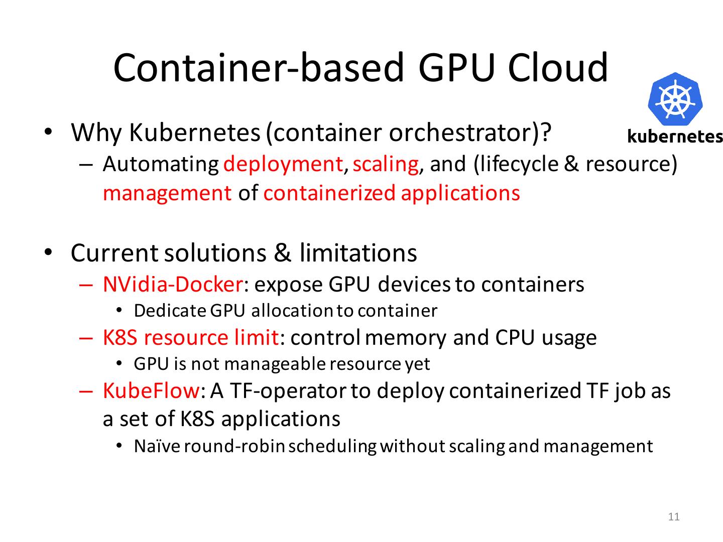 11 . Container-based GPU Cloud • Why Kubernetes (container orchestrator)? – Automating deployment, scaling, and (lifecycle & resource) management of containerized applications • Current solutions & limitations – NVidia-Docker: expose GPU devices to containers • Dedicate GPU allocation to container – K8S resource limit: control memory and CPU usage • GPU is not manageable resource yet – KubeFlow: A TF-operator to deploy containerized TF job as a set of K8S applications • Naïve round-robin scheduling without scaling and management 11