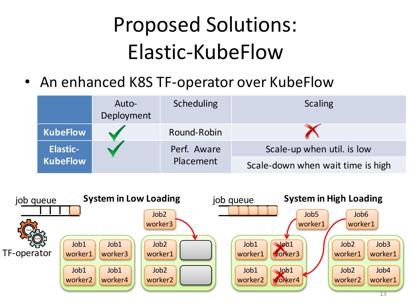 13 . Proposed Solutions: Elastic-KubeFlow • An enhanced K8S TF-operator over KubeFlow Auto- Scheduling Scaling Deployment KubeFlow Round-Robin Elastic- Perf. Aware Scale-up when util. is low KubeFlow Placement Scale-down when wait time is high job queue System in Low Loading job queue System in High Loading Job2 Job5 Job6 worker3 worker1 worker1 Job1 Job1 Job2 Job1 Job1 Job2 Job3 TF-operator worker1 worker3 worker1 worker1 worker3 worker1 worker1 Job1 Job1 Job2 Job1 Job1 Job2 Job4 worker2 worker4 worker2 worker2 worker4 worker2 worker1 13