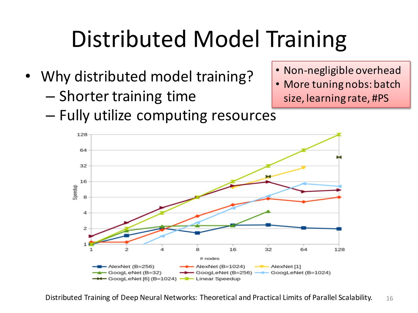 16 . Distributed Model Training • Non-negligible overhead • Why distributed model training? • More tuning nobs: batch – Shorter training time size, learning rate, #PS – Fully utilize computing resources Distributed Training of Deep Neural Networks: Theoretical and Practical Limits of Parallel Scalability. 16