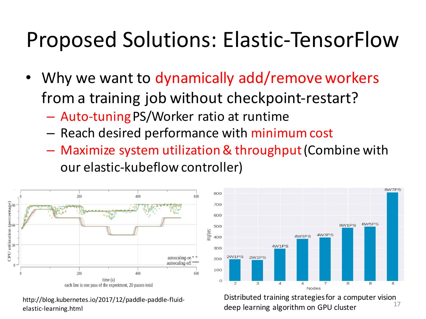 17 . Proposed Solutions: Elastic-TensorFlow • Why we want to dynamically add/remove workers from a training job without checkpoint-restart? – Auto-tuning PS/Worker ratio at runtime – Reach desired performance with minimum cost – Maximize system utilization & throughput (Combine with our elastic-kubeflow controller) http://blog.kubernetes.io/2017/12/paddle-paddle-fluid- Distributed training strategies for a computer vision 17 elastic-learning.html deep learning algorithm on GPU cluster