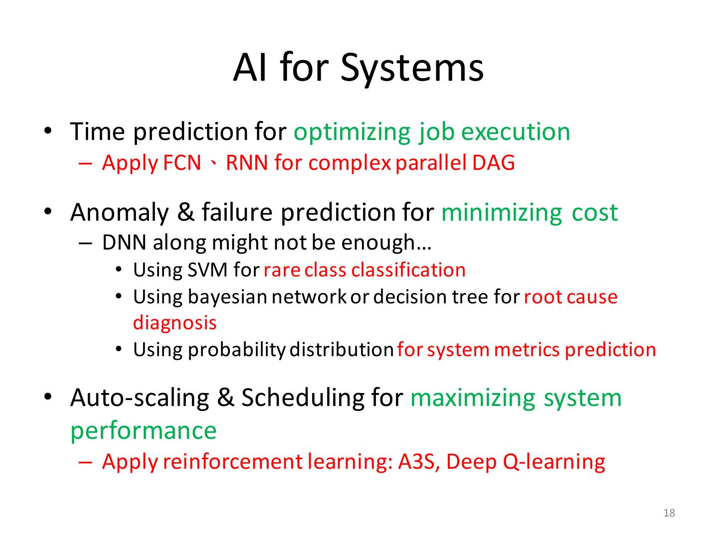 18 . AI for Systems • Time prediction for optimizing job execution – Apply FCN、RNN for complex parallel DAG • Anomaly & failure prediction for minimizing cost – DNN along might not be enough… • Using SVM for rare class classification • Using bayesian network or decision tree for root cause diagnosis • Using probability distribution for system metrics prediction • Auto-scaling & Scheduling for maximizing system performance – Apply reinforcement learning: A3S, Deep Q-learning 18