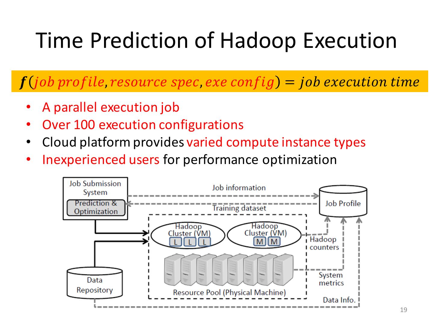 19 . Time Prediction of Hadoop Execution 𝒇 𝑗𝑜𝑏 𝑝𝑟𝑜𝑓𝑖𝑙𝑒, 𝑟𝑒𝑠𝑜𝑢𝑟𝑐𝑒 𝑠𝑝𝑒𝑐, 𝑒𝑥𝑒 𝑐𝑜𝑛𝑓𝑖𝑔 = 𝑗𝑜𝑏 𝑒𝑥𝑒𝑐𝑢𝑡𝑖𝑜𝑛 𝑡𝑖𝑚𝑒 • A parallel execution job • Over 100 execution configurations • Cloud platform provides varied compute instance types • Inexperienced users for performance optimization 19