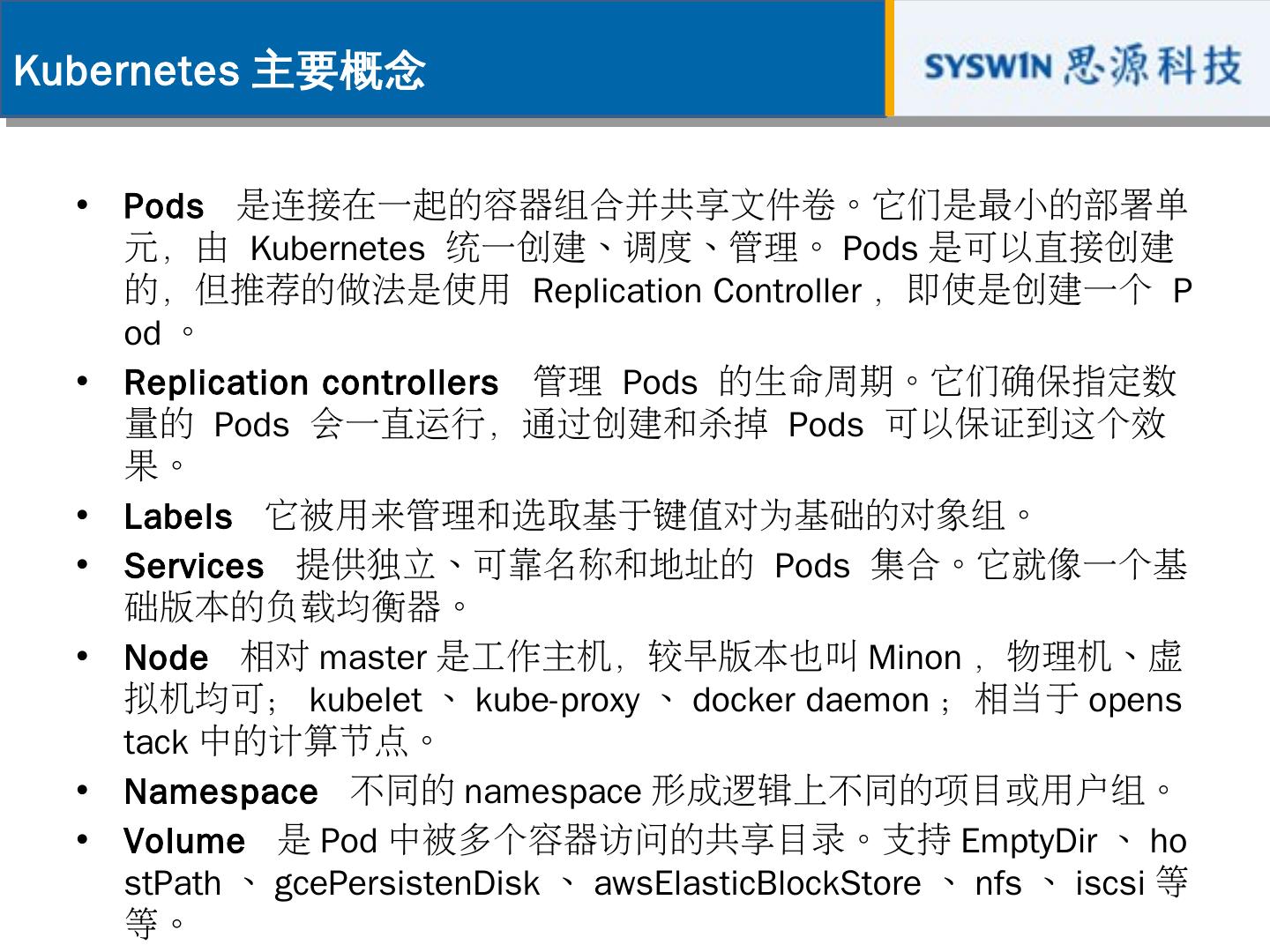 6 .Kubernetes 主要概念 Pods 是连接在一起的容器组合并共享文件卷。它们是最小的部署单元,由 Kubernetes 统一创建、调度、管理。 Pods 是可以直接创建的,但推荐的做法 是使用 Replication Controller ,即使是创建一个 Pod 。 Replication controllers 管理 Pods 的生命周期。它们确保指定数量的 Pods 会一直运行,通过创建和杀掉 Pods 可以保证到这个效果。 Labels 它被用来管理和选取基于键值对为基础的对象组。 Services 提供独立、可靠名称和地址的 Pods 集合。它就像一个基础版本的负载均衡器 。 Node 相对 master 是工作主机,较早版本也叫 Minon ,物理机、虚拟机均可; kubelet 、 kube -proxy 、 docker daemon ;相当于 openstack 中的计算节点。 Namespace 不同的 namespace 形成逻辑上不同的项目或用户组。 Volume 是 Pod 中被多个容器访问的共享目录。支持 EmptyDir 、 hostPath 、 gcePersistenDisk 、 awsElasticBlockStore 、 nfs 、 iscsi 等等。