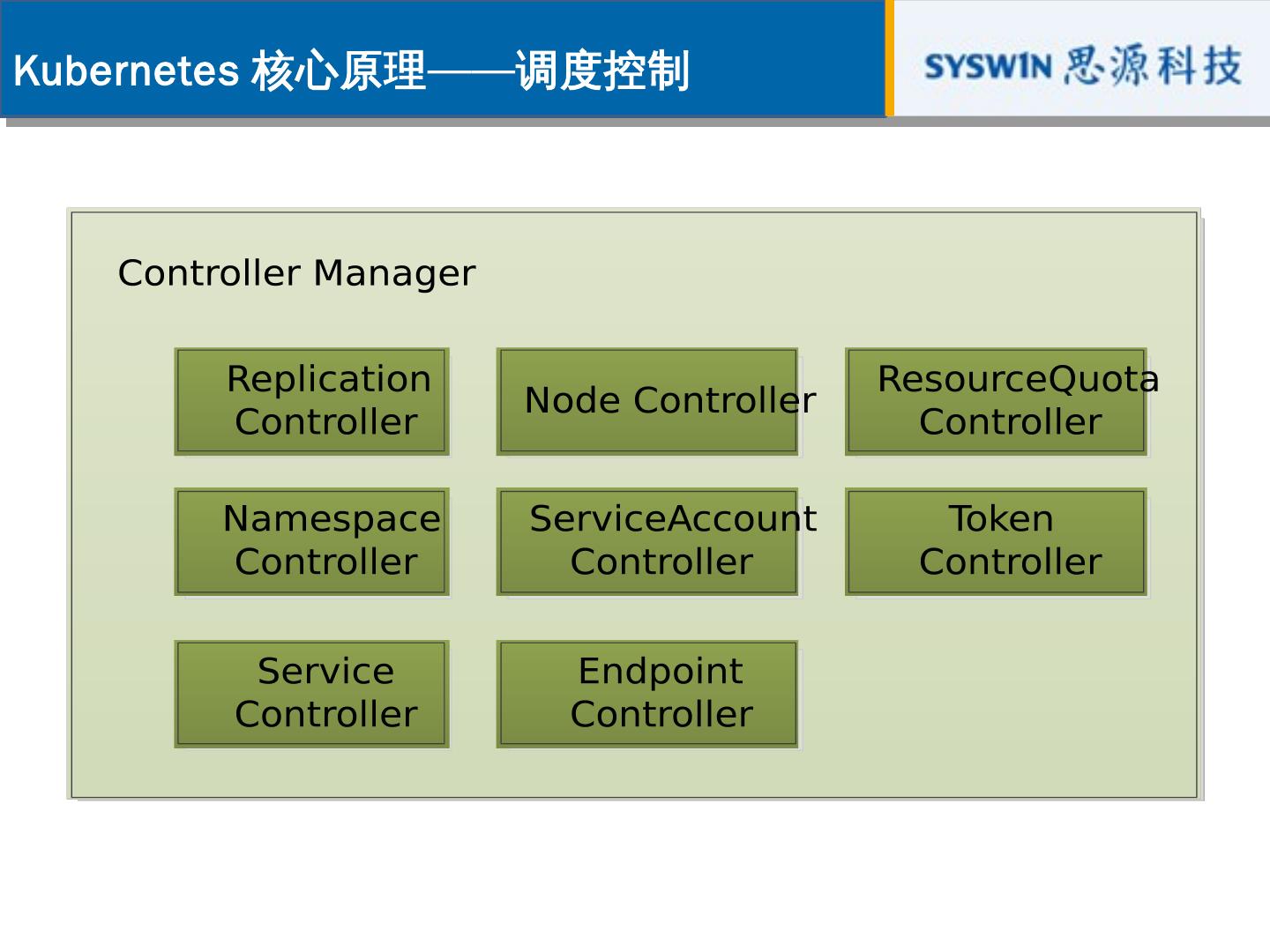 11 .Kubernetes 核心原理 —— 调度控制 Replication Controller 确保在任何时候集群中一个 rc 下的 pod 都保持一定数量的 pod 副本处于正常运行状态。 重新调度、弹性伸缩。 滚动更新( Rolling Updates ) Node Controller 负责发现、管理和监控集群中的各个 Node 节点。 ResourceQuota Controller 资源配额管理确保制定对象在任何时候都不会超量占用系统资源。 三个维度配额:容器( C/M )、 Pod 、 namespace ( pod 、 rc 、 service 、 resourceQuota 、 Secret 、 PV )