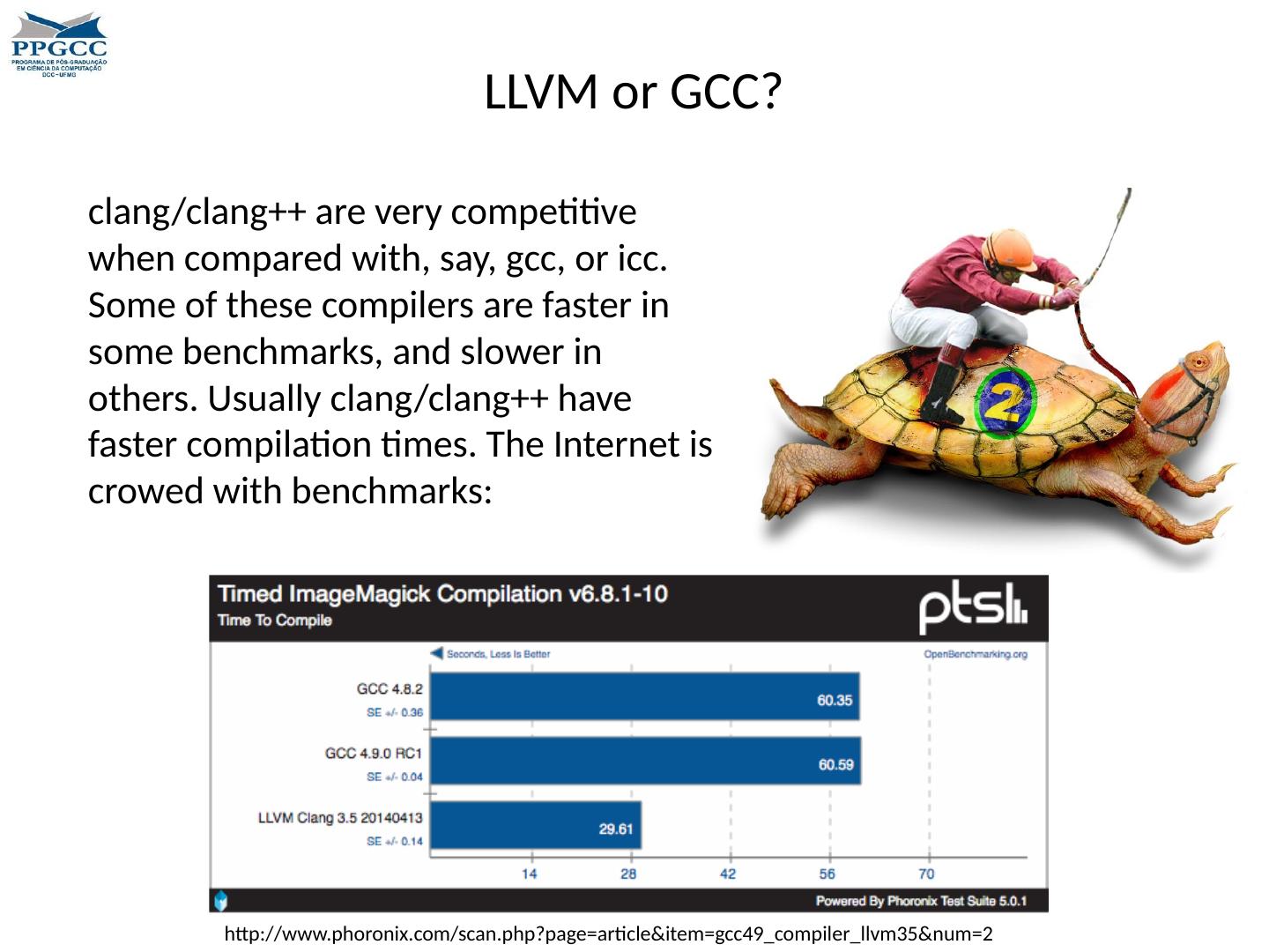 8 .LLVM or GCC? clang/clang++ are very competitive when compared with, say, gcc , or icc . Some of these compilers are faster in some benchmarks, and slower in others. Usually clang/clang++ have faster compilation times. The Internet is crowed with benchmarks: http:// www.phoronix.com/scan.php?page = article&item =gcc49_compiler_llvm35&num=2