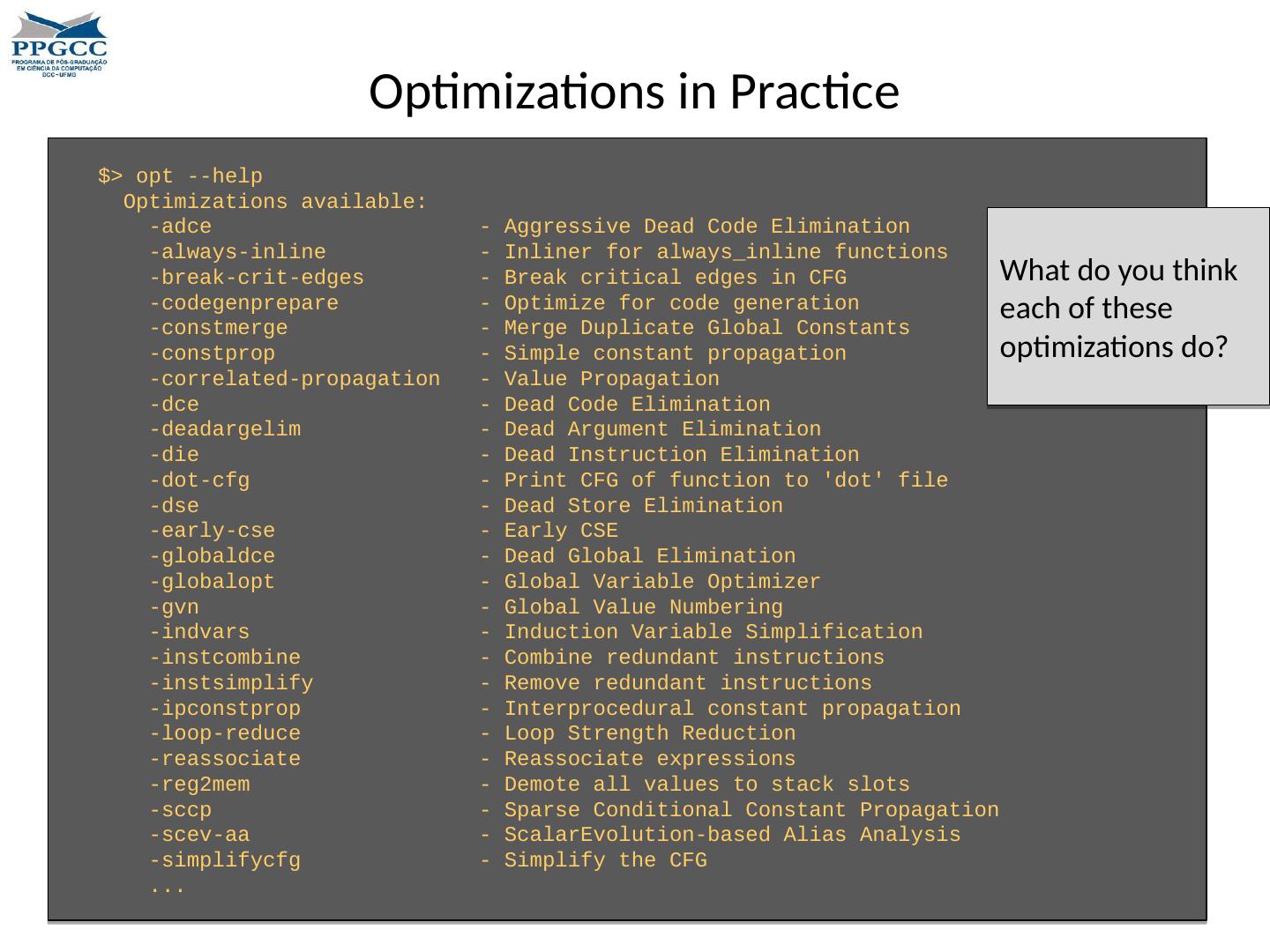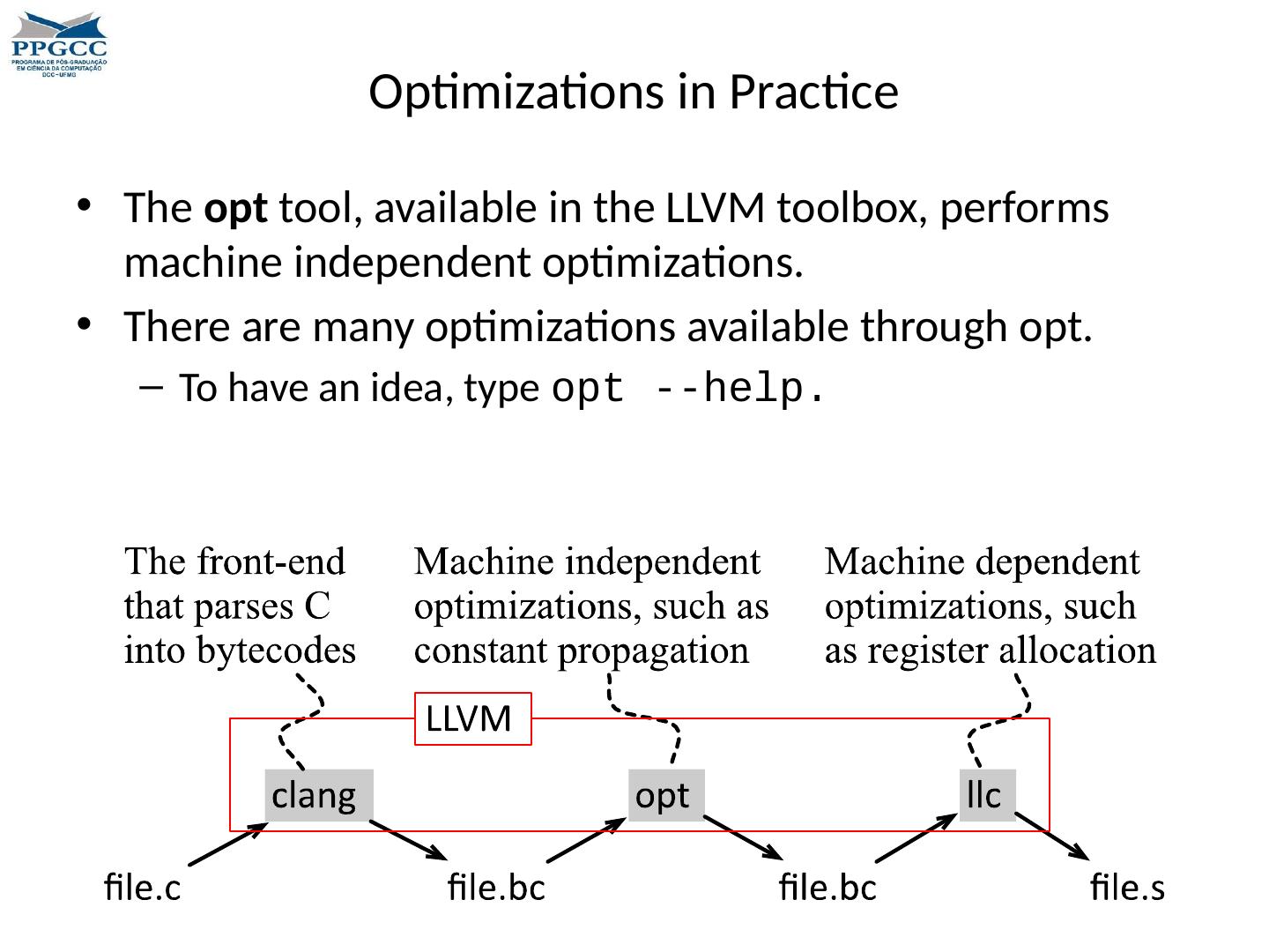 14 .Optimizations in Practice The opt tool, available in the LLVM toolbox, performs machine independent optimizations. There are many optimizations available through opt. To have an idea, type opt --help.