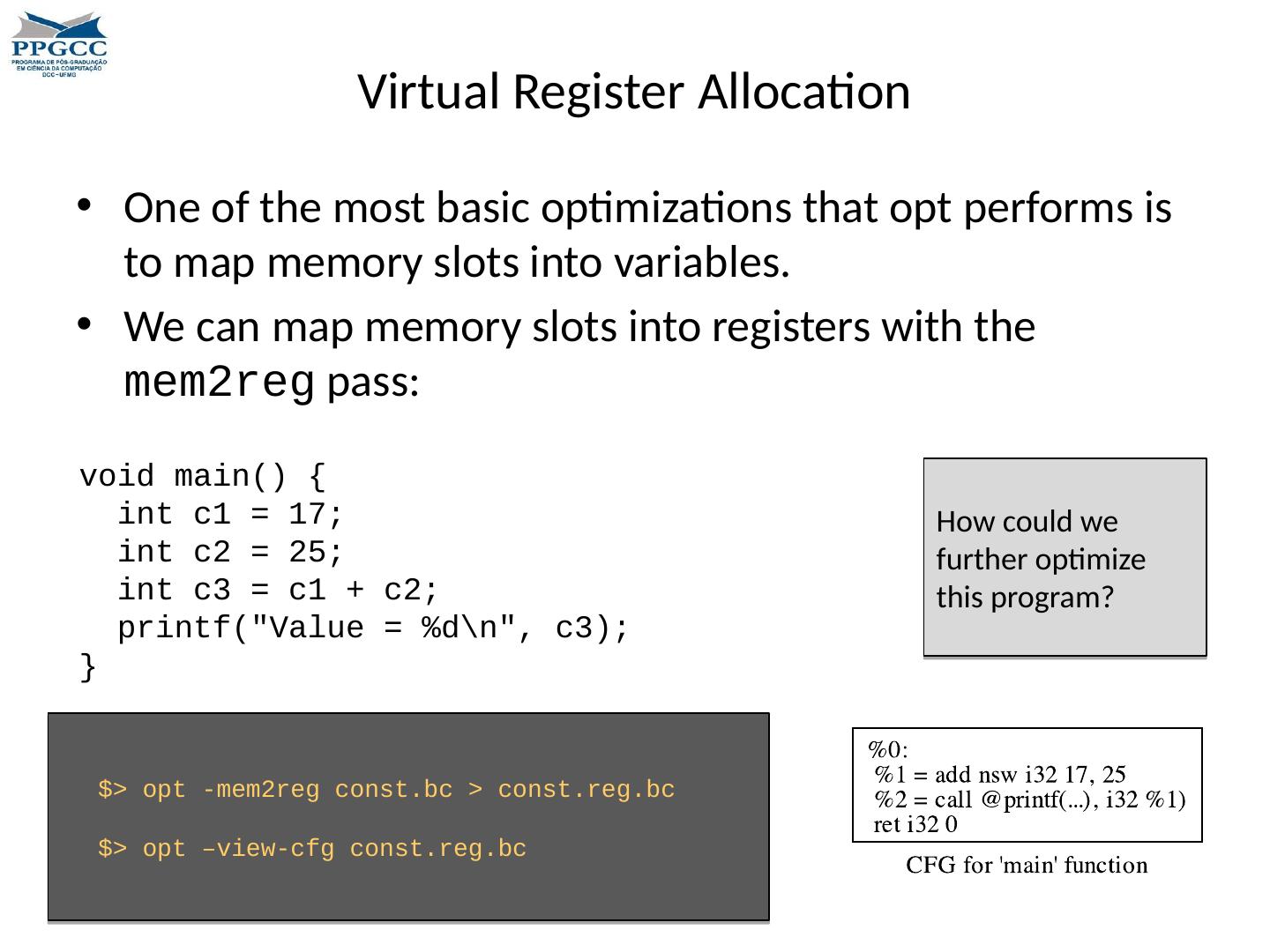 18 .Virtual Register Allocation One of the most basic optimizations that opt performs is to map memory slots into variables. This optimization is very useful, because the clang front end maps every variable to memory: void main() { int c1 = 17; int c2 = 25; int c3 = c1 + c2; printf("Value = % d