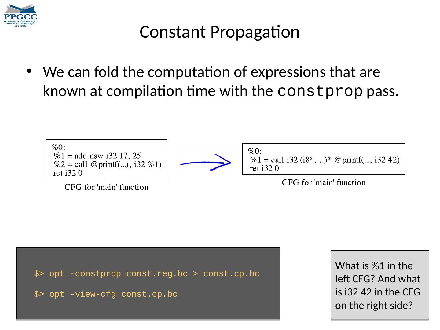 20 .Constant Propagation We can fold the computation of expressions that are known at compilation time with the constprop pass. $> opt - constprop const.reg.bc > const.cp.bc $> opt –view- cfg const.cp.bc What is %1 in the left CFG? And what is i32 42 in the CFG on the right side?