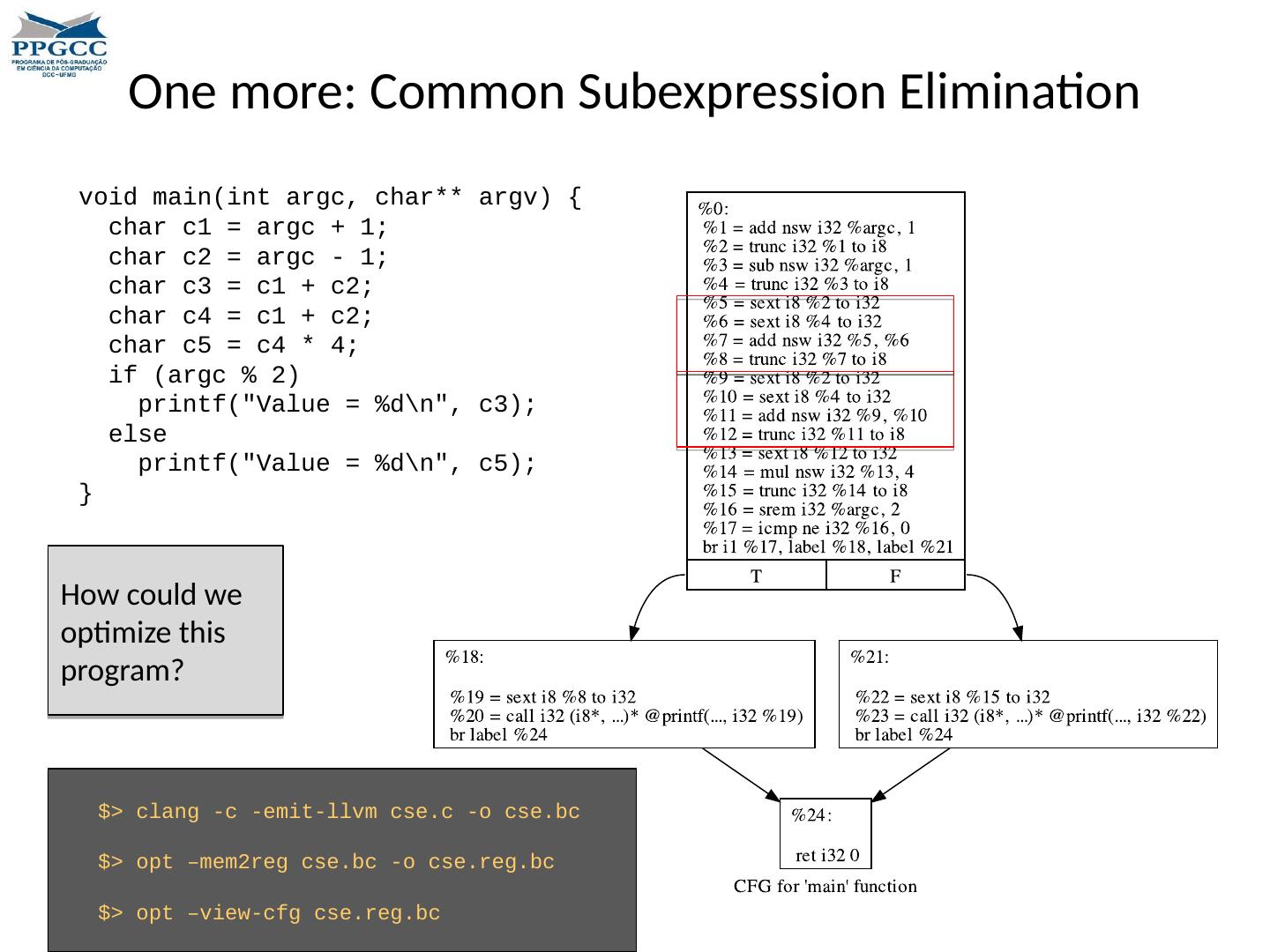 21 .One more: Common Subexpression Elimination void main(int argc , char** argv ) { char c1 = argc + 1; char c2 = argc - 1; char c3 = c1 + c2; char c4 = c1 + c2; char c5 = c4 * 4; if ( argc % 2) printf("Value = % d
