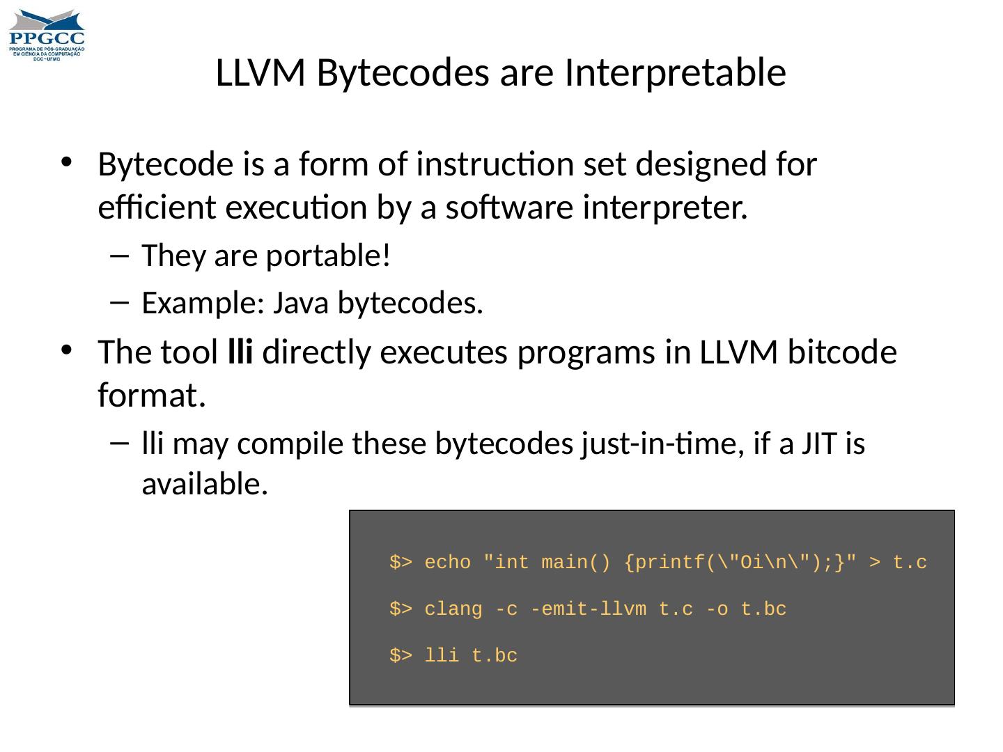 24 .LLVM Bytecodes are Interpretable Bytecode is a form of instruction set designed for efficient execution by a software interpreter. They are portable! Example: Java bytecodes . The tool lli directly executes programs in LLVM bitcode format. lli may compile these bytecodes just-in-time, if a JIT is available. $> echo " int main() { printf(\"Oi