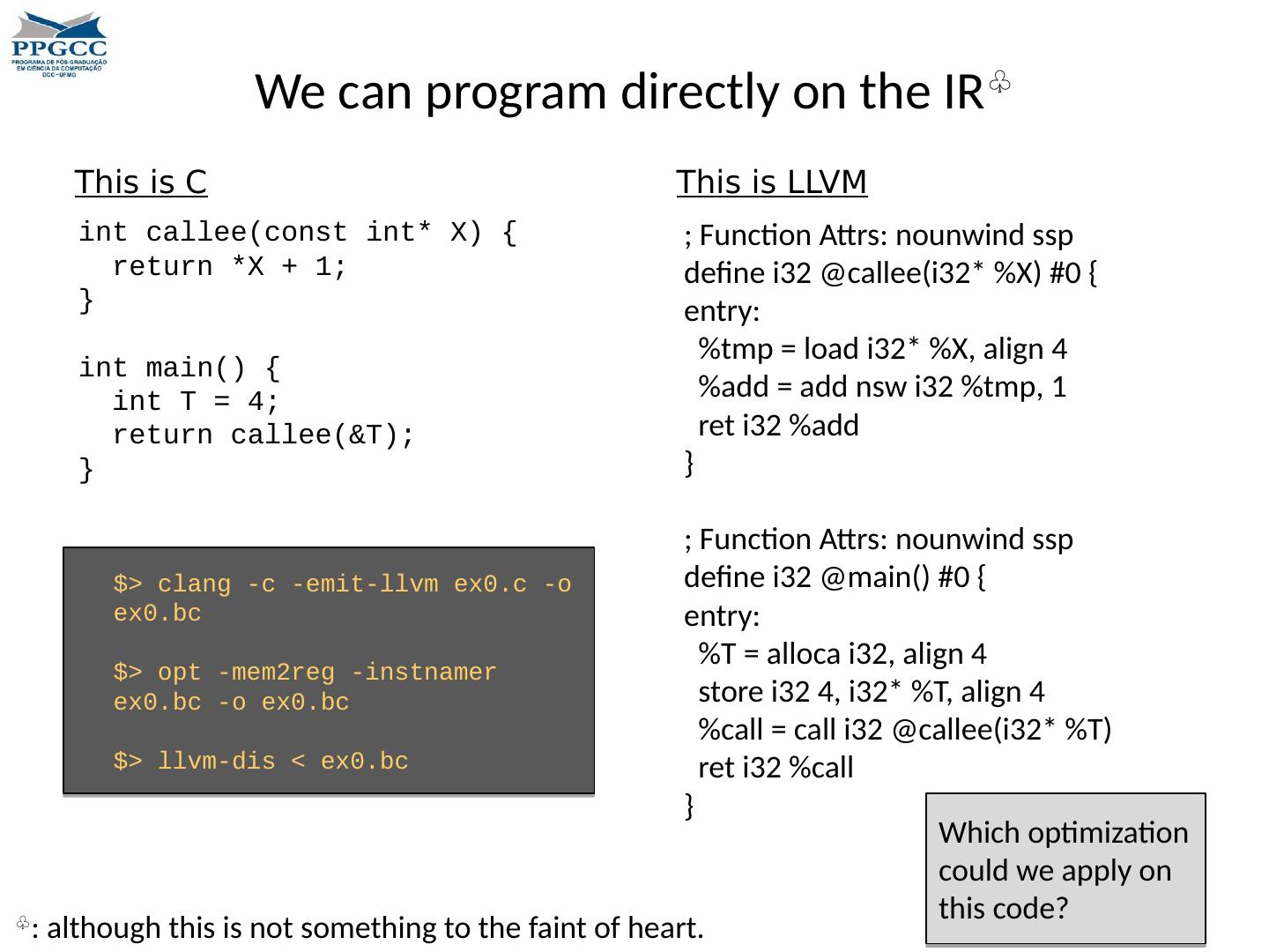 26 .We can program directly on the IR ♧ ♧ : although this is not something to the faint of heart. int callee(const int * X) { return *X + 1; } int main() { int T = 4; return callee(&T ); } This is C This is LLVM ; Function Attrs : nounwind ssp define i32 @callee(i32* %X) #0 { entry: % tmp = load i32* %X, align 4 %add = add nsw i32 % tmp , 1 ret i32 %add } ; Function Attrs : nounwind ssp define i32 @main() #0 { entry: %T = alloca i32, align 4 store i32 4, i32* %T, align 4 %call = call i32 @callee(i32* %T) ret i32 %call } $> clang - c -emit- llvm ex0.c - o ex0.bc $> opt -mem2reg - instnamer ex0.bc - o ex0.bc $> llvm-dis < ex0.bc Which optimization could we apply on this code?