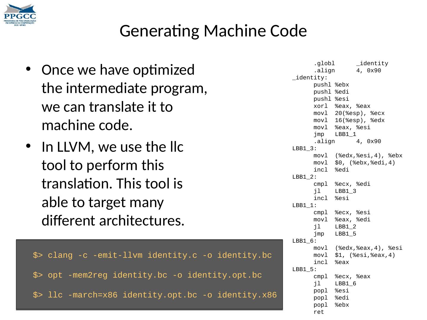 29 .Generating Machine Code Once we have optimized the intermediate program, we can translate it to machine code. In LLVM, we use the llc tool to perform this translation. This tool is able to target many different architectures. $> llc --version Registered Targets: alpha - Alpha [experimental] arm - ARM bfin - Analog Devices Blackfin c - C backend cellspu - STI CBEA Cell SPU cpp - C++ backend mblaze - MBlaze mips - Mips mips64 - Mips64 [experimental] mips64el - Mips64el [experimental] mipsel - Mipsel msp430 - MSP430 [experimental] ppc32 - PowerPC 32 ppc64 - PowerPC 64 ptx32 - PTX (32-bit) [Experimental] ptx64 - PTX (64-bit) [Experimental] sparc - Sparc sparcv9 - Sparc V9 systemz - SystemZ thumb - Thumb x86 - 32-bit X86: Pentium-Pro x86-64 - 64-bit X86: EM64T and AMD64 xcore - XCore