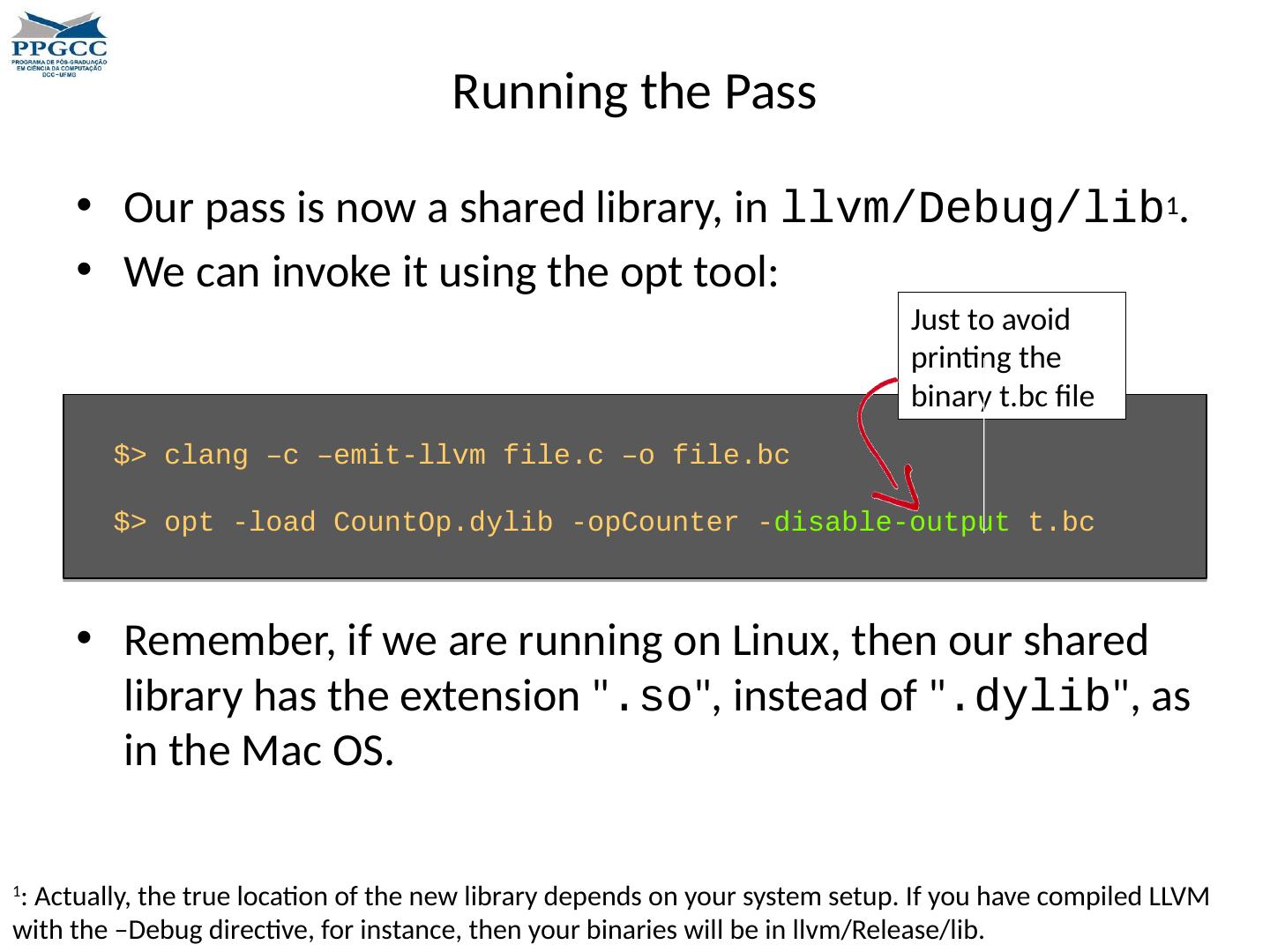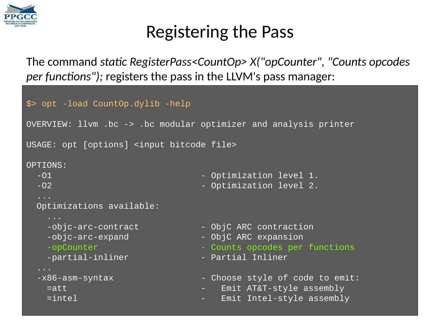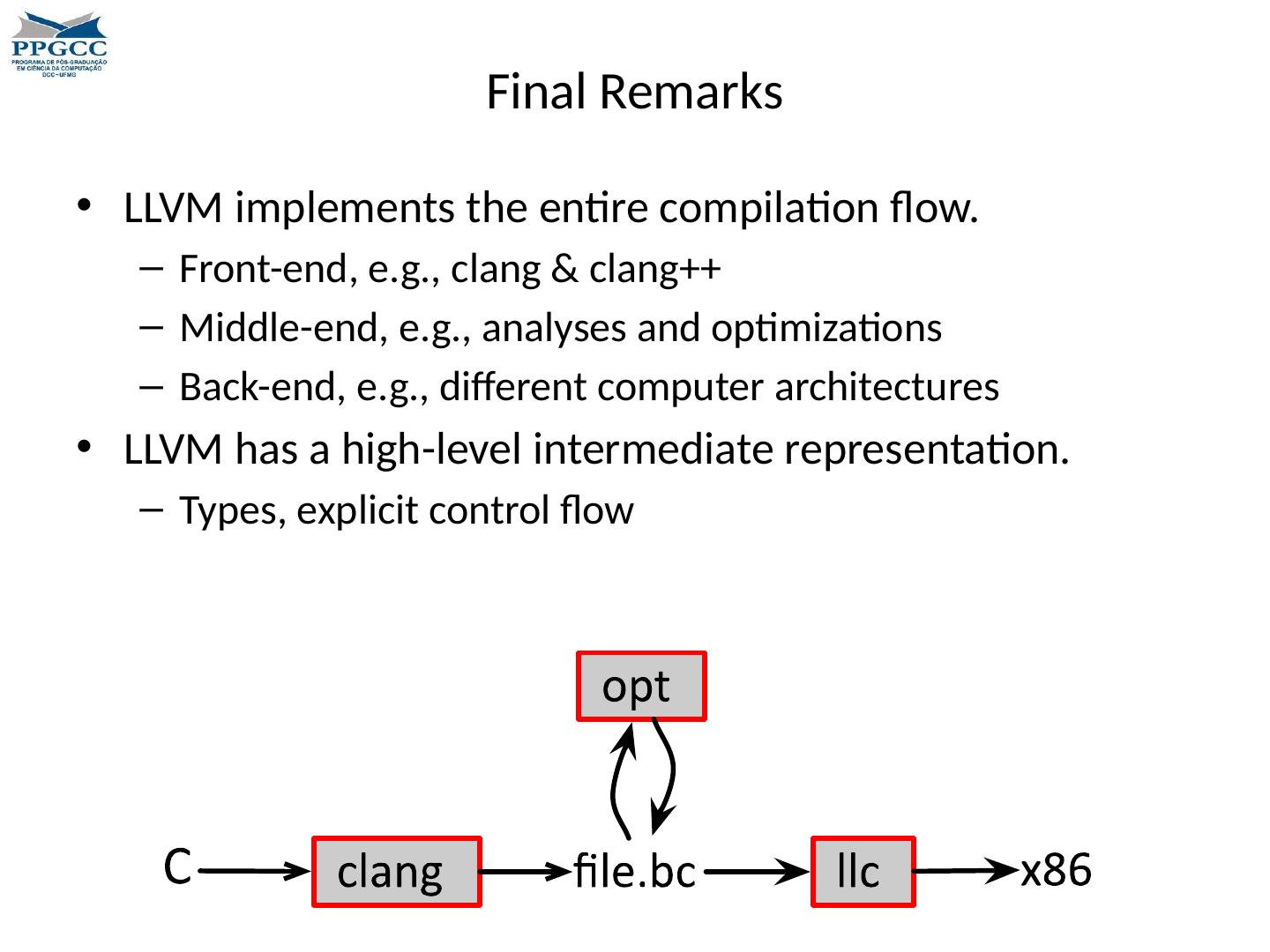 16 .Levels of Optimizations Like gcc , clang supports different levels of optimizations, e.g., -O0 (default), -O1, -O2 and -O3. To find out which optimization each level uses, you can try: $> llvm -as < /dev/null | opt -O3 -disable-output -debug-pass=Arguments In my system (LLVM/Darwin), -O1 gives me: - targetlibinfo -no- aa - tbaa - basicaa - notti - globalopt - ipsccp - deadargelim - instcombine - simplifycfg - basiccg -prune-eh -inline-cost -always-inline - functionattrs - sroa - domtree -early- cse -lazy-value-info -jump-threading -correlated-propagation - simplifycfg - instcombine - tailcallelim - simplifycfg - reassociate - domtree -loops -loop-simplify - lcssa -loop-rotate - licm - lcssa -loop- unswitch - instcombine -scalar-evolution -loop-simplify - lcssa - indvars -loop-idiom -loop-deletion -loop-unroll - memdep - memcpyopt - sccp - instcombine -lazy-value-info -jump-threading -correlated-propagation - domtree - memdep - dse - adce - simplifycfg - instcombine -strip-dead-prototypes - preverify - domtree -verify llvm -as is the LLVM assembler. It reads a file containing human-readable LLVM assembly language, translates it to LLVM bytecode , and writes the result into a file or to standard output.