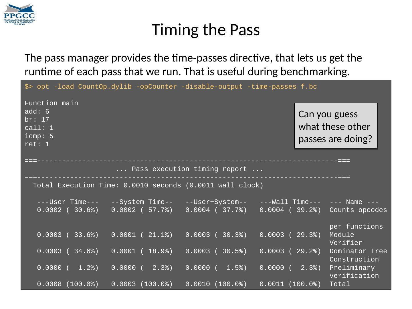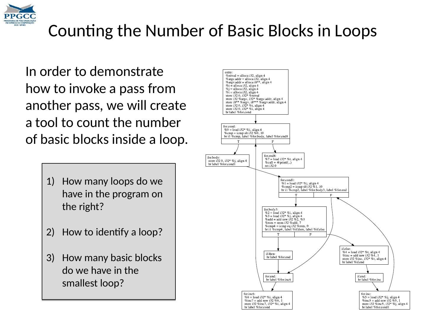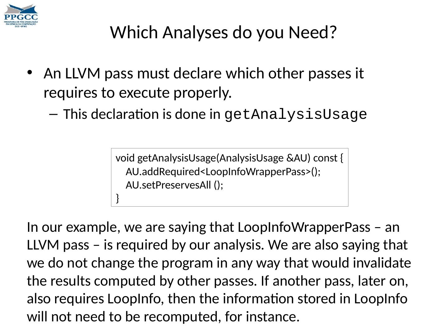 17 .Levels of Optimizations Like gcc , clang supports different levels of optimizations, e.g., -O0 (default), -O1, -O2 and -O3. To find out which optimization each level uses, you can try: $> llvm -as < /dev/null | opt -O3 -disable-output -debug-pass=Arguments In my system (LLVM/Darwin), -O1 gives me: - targetlibinfo -no- aa - tbaa - basicaa - notti - globalopt - ipsccp - deadargelim - instcombine - simplifycfg - basiccg -prune-eh -inline-cost -always-inline - functionattrs - sroa - domtree -early- cse -lazy-value-info -jump-threading -correlated-propagation - simplifycfg - instcombine - tailcallelim - simplifycfg - reassociate - domtree -loops -loop-simplify - lcssa -loop-rotate - licm - lcssa -loop- unswitch - instcombine -scalar-evolution -loop-simplify - lcssa - indvars -loop-idiom -loop-deletion -loop-unroll - memdep - memcpyopt - sccp - instcombine -lazy-value-info -jump-threading -correlated-propagation - domtree - memdep - dse - adce - simplifycfg - instcombine -strip-dead-prototypes - preverify - domtree -verify Can you guess why the same analysis or optimization may run more than once?