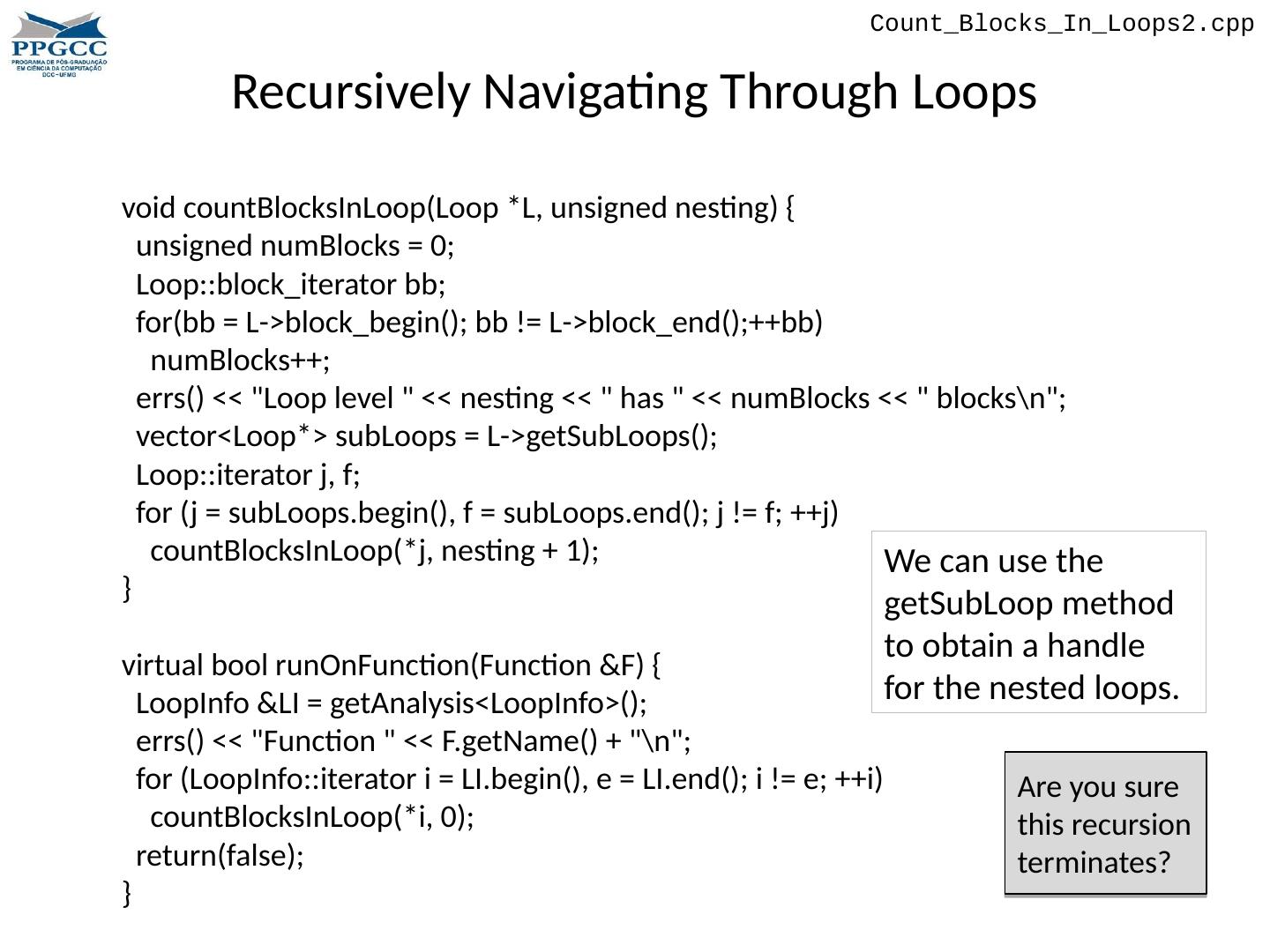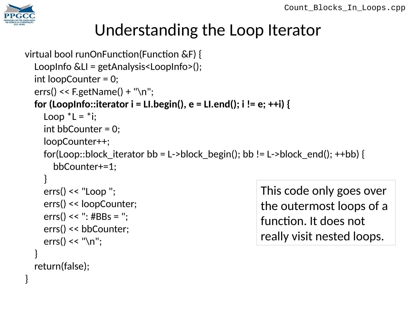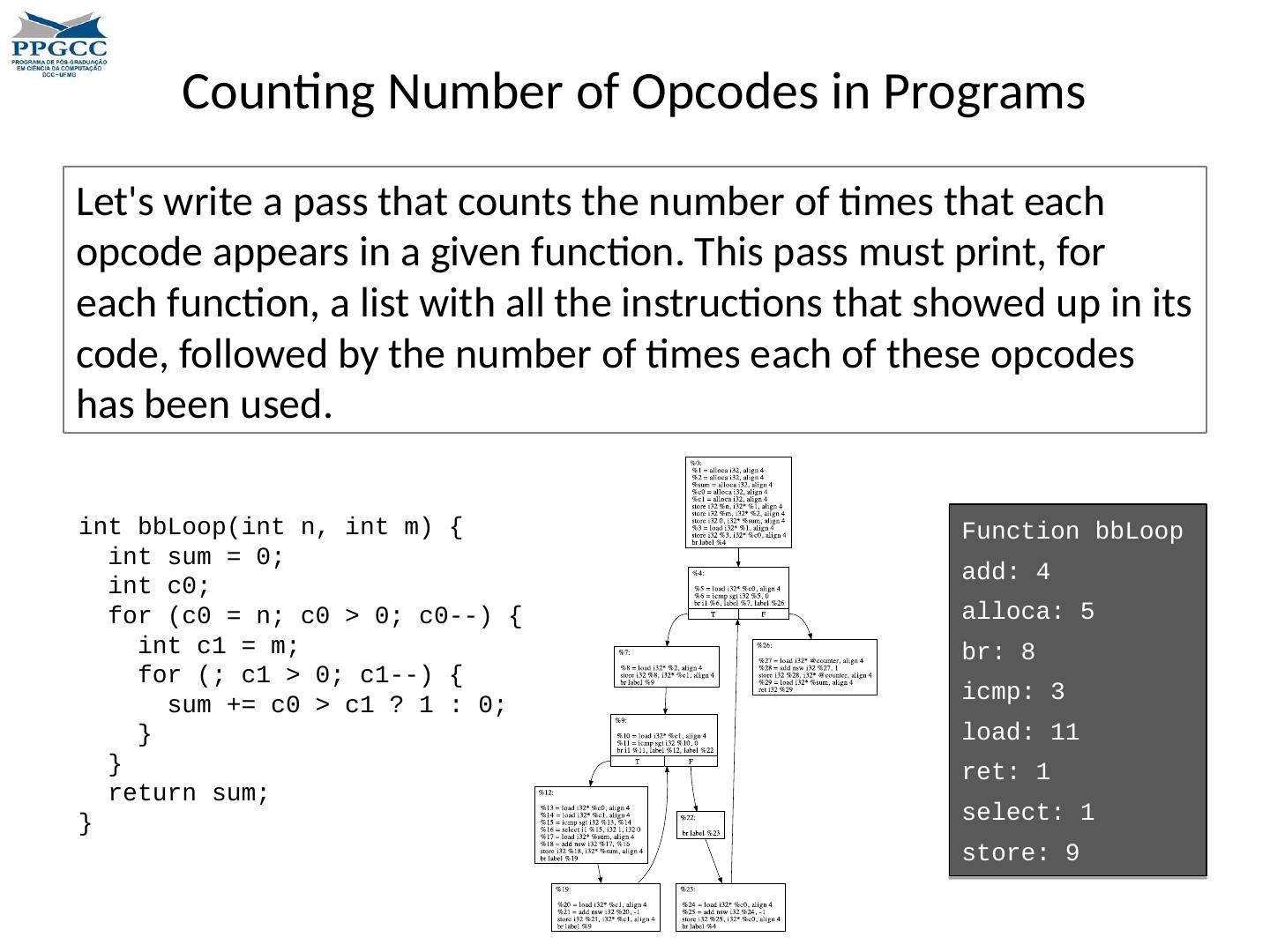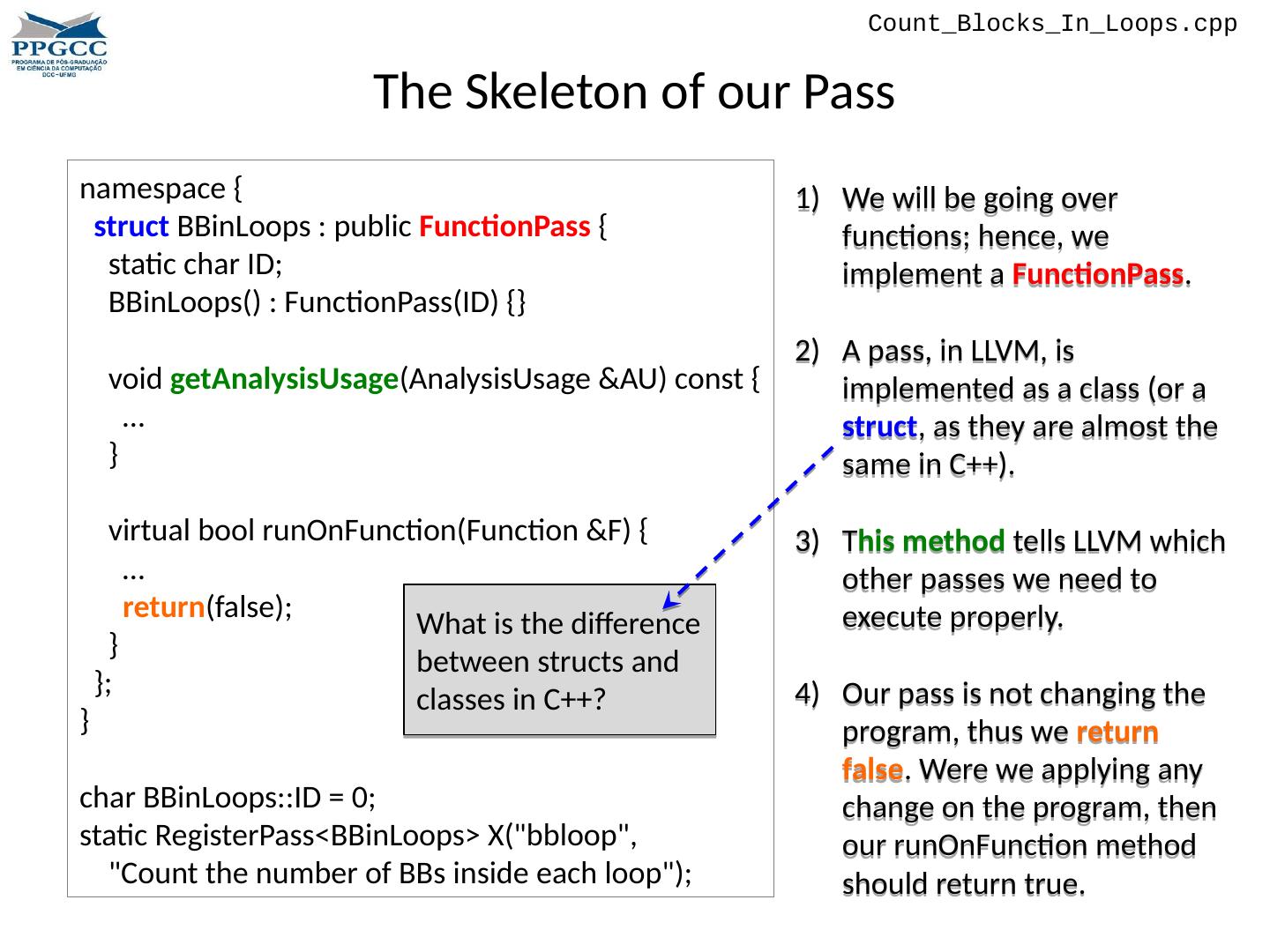 17 .Levels of Optimizations Like gcc , clang supports different levels of optimizations, e.g., -O0 (default), -O1, -O2 and -O3. To find out which optimization each level uses, you can try: $> llvm -as < /dev/null | opt -O3 -disable-output -debug-pass=Arguments In my system (LLVM/Darwin), -O1 gives me: - targetlibinfo -no- aa - tbaa - basicaa - notti - globalopt - ipsccp - deadargelim - instcombine - simplifycfg - basiccg -prune-eh -inline-cost -always-inline - functionattrs - sroa - domtree -early- cse -lazy-value-info -jump-threading -correlated-propagation - simplifycfg - instcombine - tailcallelim - simplifycfg - reassociate - domtree -loops -loop-simplify - lcssa -loop-rotate - licm - lcssa -loop- unswitch - instcombine -scalar-evolution -loop-simplify - lcssa - indvars -loop-idiom -loop-deletion -loop-unroll - memdep - memcpyopt - sccp - instcombine -lazy-value-info -jump-threading -correlated-propagation - domtree - memdep - dse - adce - simplifycfg - instcombine -strip-dead-prototypes - preverify - domtree -verify Can you guess why the same analysis or optimization may run more than once?