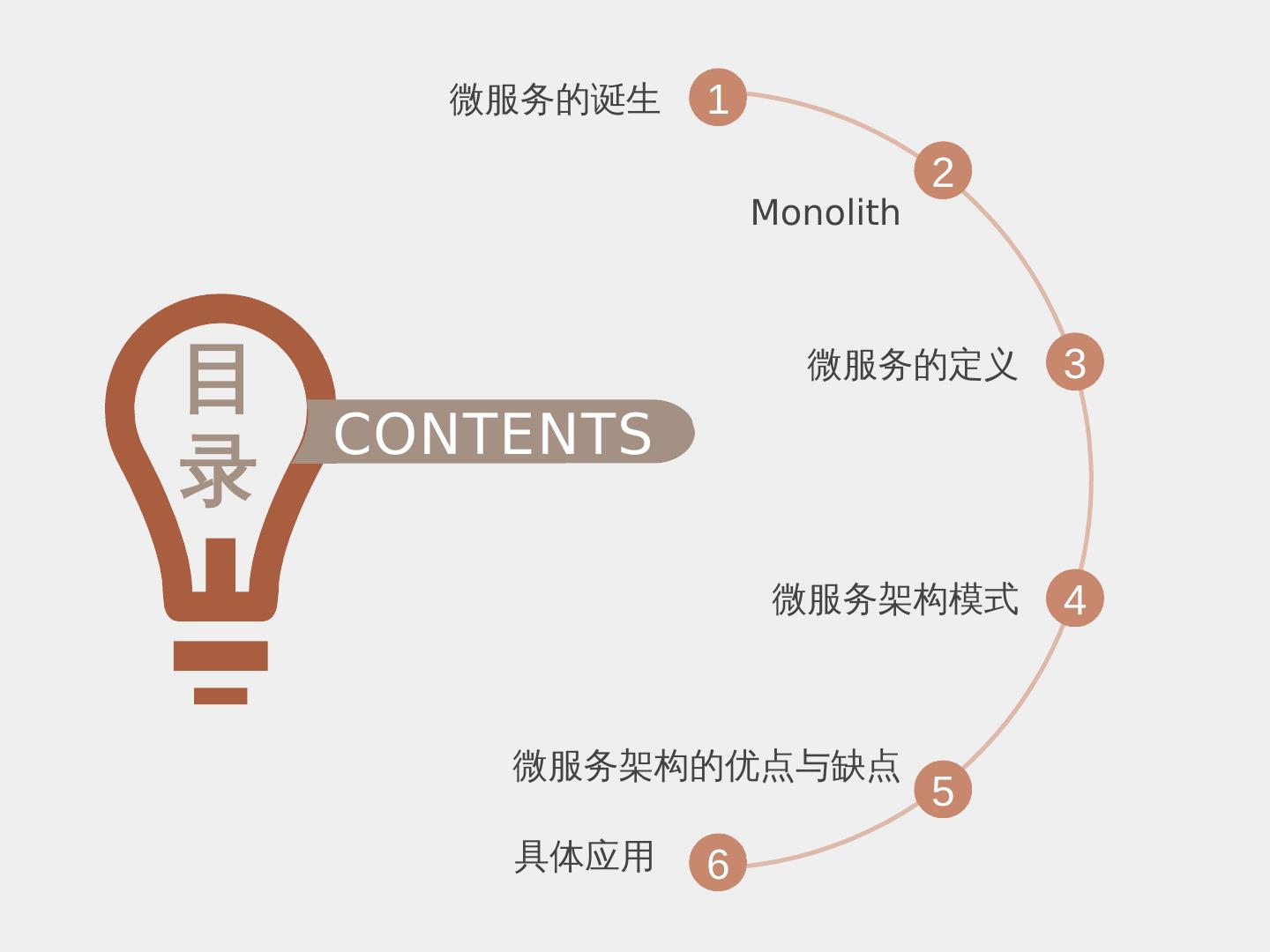 2 .6 5 4 3 2 1 目 录 CONTENTS 微服务的诞生 具体应用 Monolith 微服务架构的优点与缺点 微服务的定义 微服务架构模式