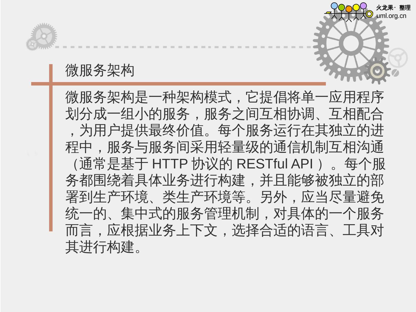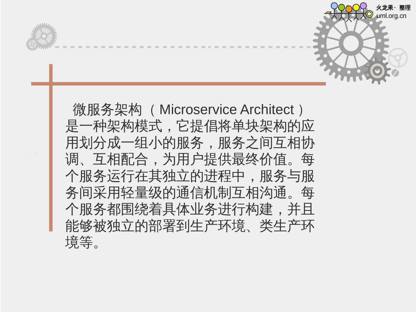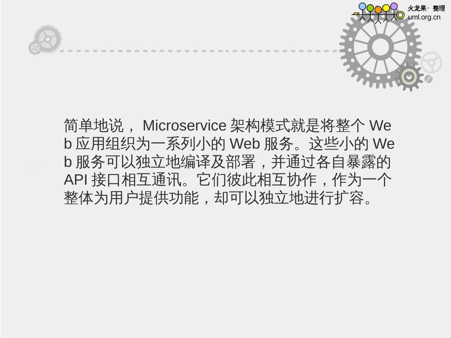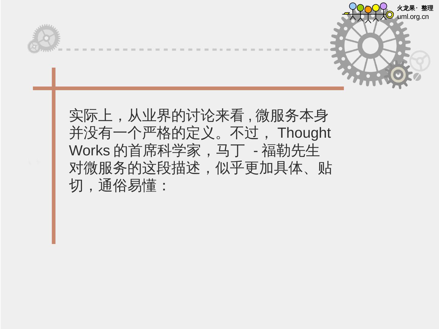 17 .实际上,从业界的讨论来看 , 微服务本身并没有一个严格的定义。不过, ThoughtWorks 的首席科学家,马丁 - 福勒先生对微服务的这段描述,似乎更加具体、贴切,通俗易懂: