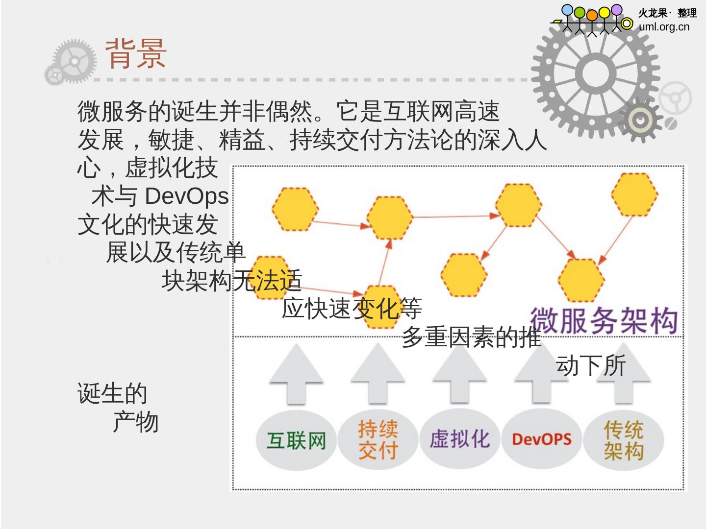 5 .背景 微服务的诞生并非偶然。它是互联网 高速 发展 ,敏捷、精益、持续交付方法论的深入 人 心 ,虚拟化 技 术与 DevOps 文化 的 快速发 展 以及传统 单 块架构 无法 适 应 快速 变化等 多重 因素的 推 动下所 诞生 的 产物
