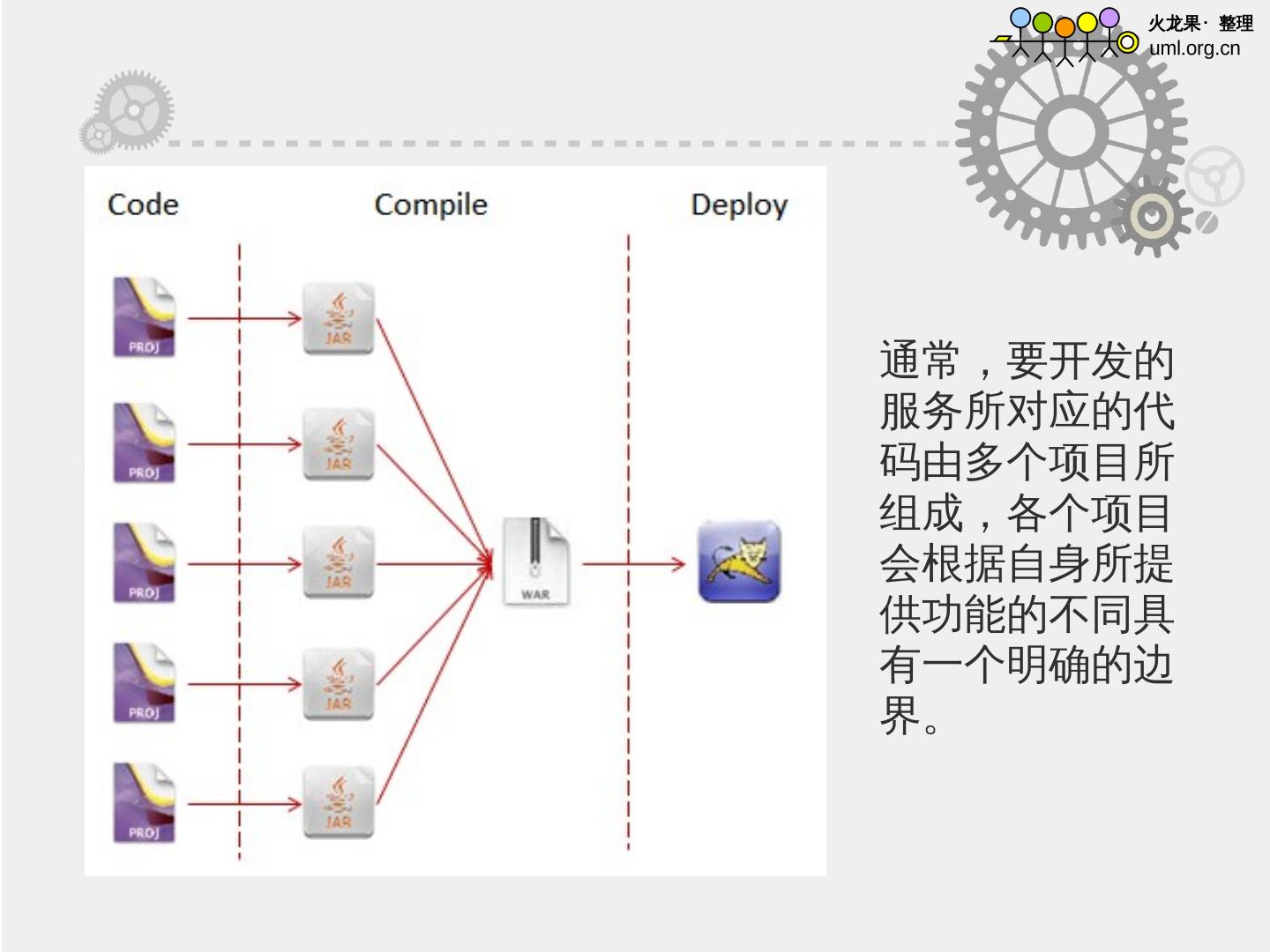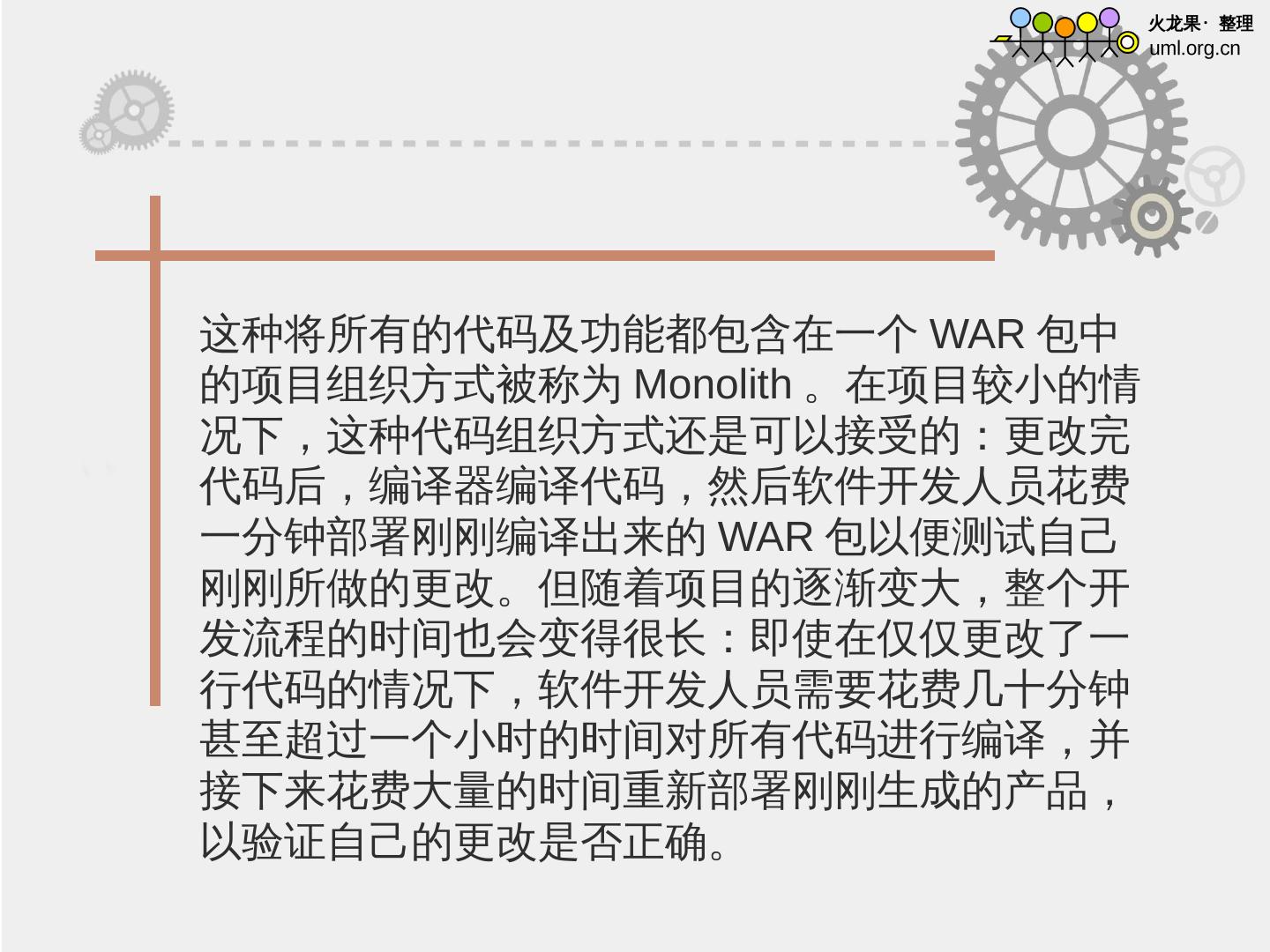 10 .这种将所有的代码及功能都包含在一个 WAR 包中的项目组织方式被称为 Monolith 。在项目较小的情况下,这种代码组织方式还是可以接受的:更改完代码后 ,编译器 编译代码,然后软件开发人员花费一分钟部署刚刚编译出来的 WAR 包以便测试自己刚刚所做的更改。但随着项目的逐渐变大,整个开发流程的时间也会变得很长:即使在仅仅更改了一行代码的情况下,软件开发人员需要花费几十分钟甚至超过一个小时的时间对所有代码进行编译,并接下来花费大量的时间重新部署刚刚生成的产品,以验证自己的更改是否正确。