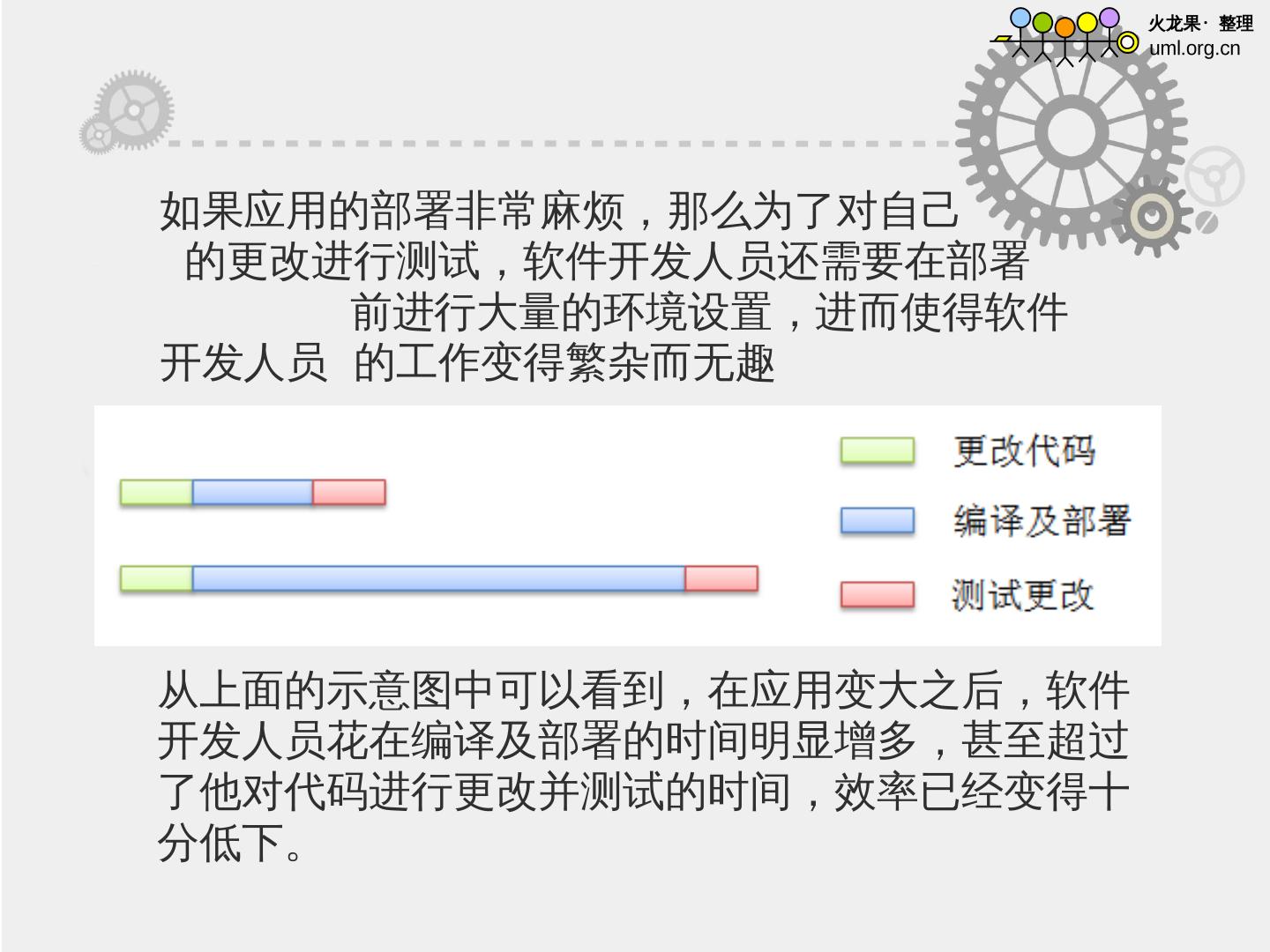 11 .如果应用的部署非常麻烦,那么为了对 自己 的 更改进行测试,软件开发人员还需要在 部署 前 进行大量的环境设置,进而使得软件开发 人员 的 工作变得繁杂而无趣 从上面的示意图中可以看到,在应用变大之后,软件开发人员花在编译及部署的时间明显增多,甚至超过了他对代码进行更改并测试的时间,效率已经变得十分低下。