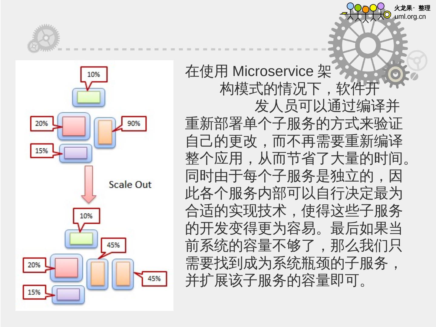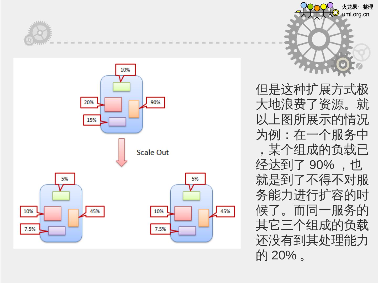 13 .但是这种扩展方式极大地浪费了资源。就以上图所展示的情况为例:在一个服务中,某个组成的负载已经达到了 90% ,也就是到了不得不对服务能力进行扩容的时候了。而同一服务的其它三个组成的负载还没有到其处理能力的 20% 。