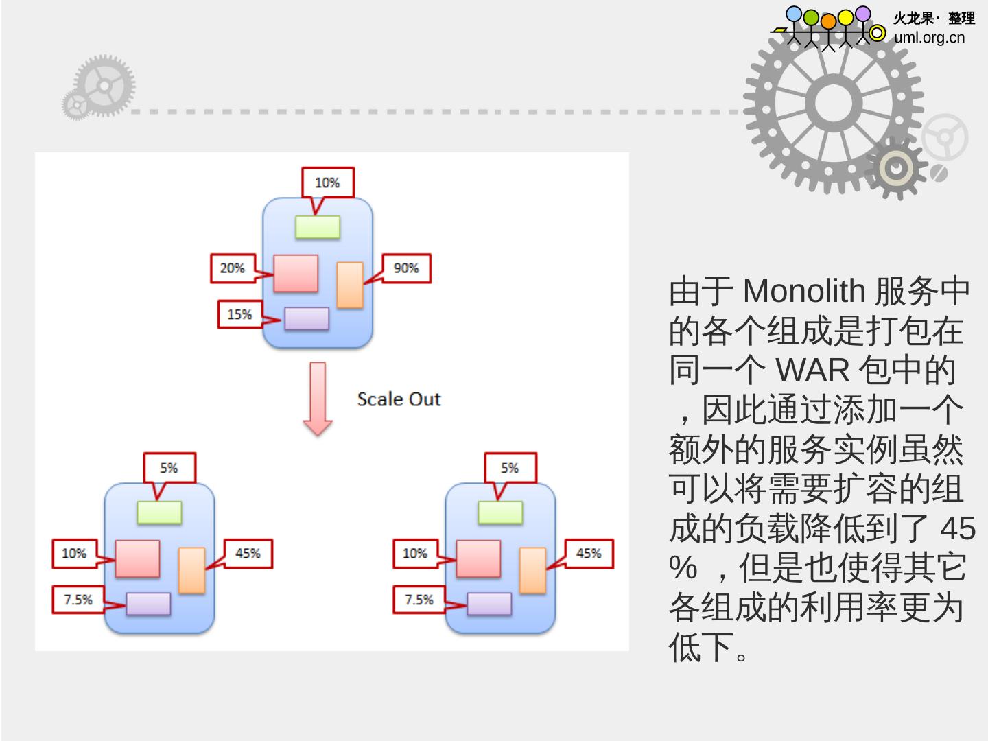 14 .由于 Monolith 服务中的各个组成是打包在同一个 WAR 包中的,因此通过添加一个额外的服务实例虽然可以将需要扩容的组成的负载降低到了 45% ,但是也使得其它各组成的利用率更为低下 。