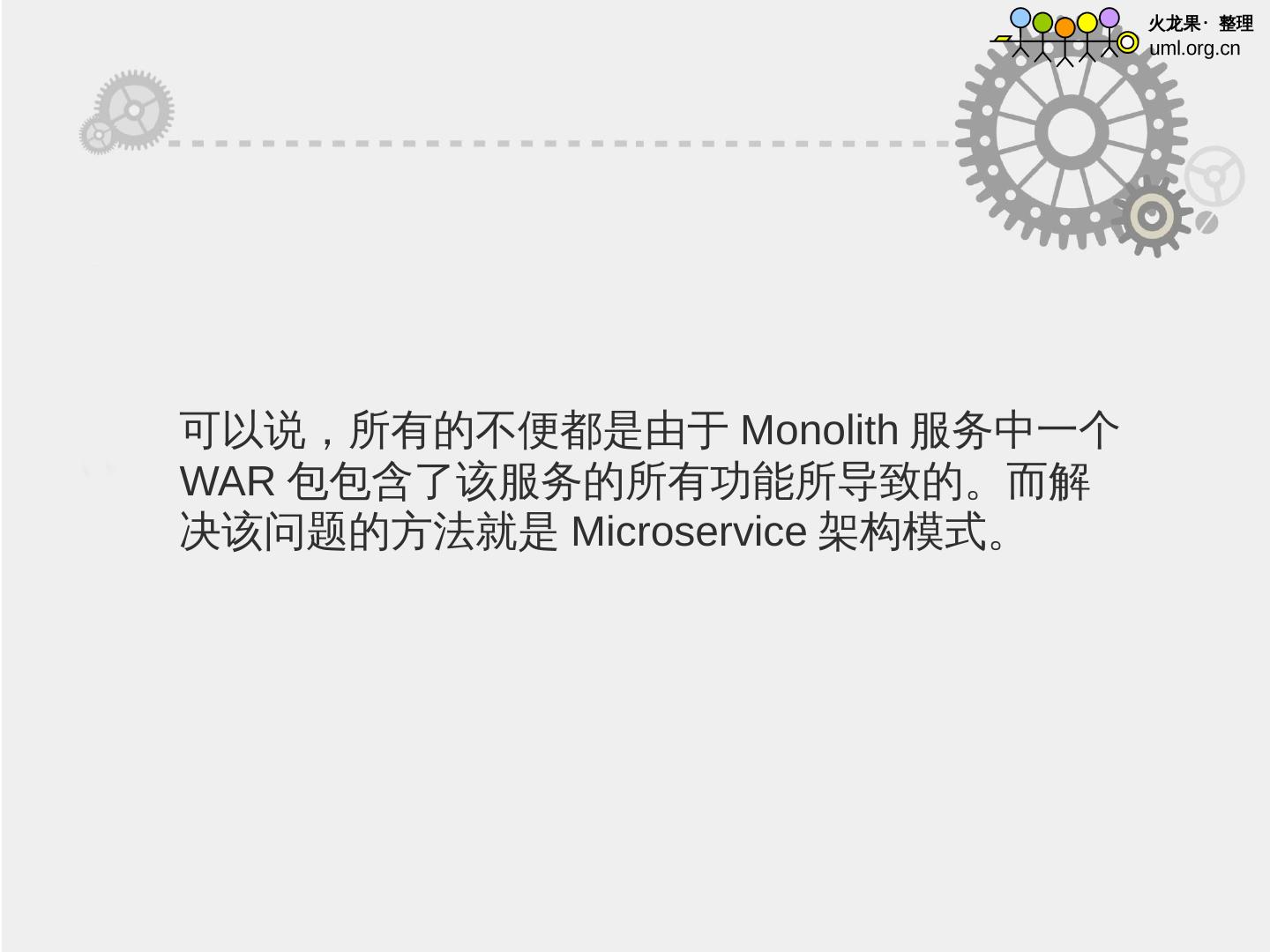 15 .可以说,所有的不便都是由于 Monolith 服务中一个 WAR 包包含了该服务的所有功能所导致的。而解决该问题的方法就是 Microservice 架构模式。