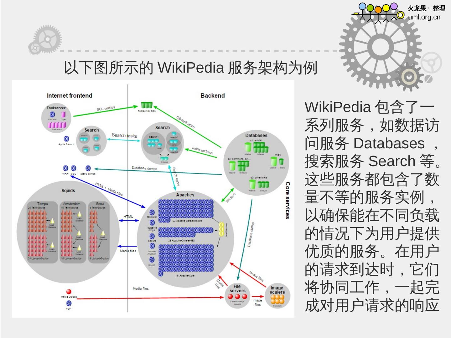 23 .以下图所示的 WikiPedia 服务架构为例 WikiPedia 包含了一系列服务,如数据访问服务 Databases ,搜索服务 Search 等。这些服务都包含了数量不等的服务实例,以确保能在不同负载的情况下为用户提供优质的服务。在用户的请求到达时,它们将协同工作,一起完成对用户请求的响应