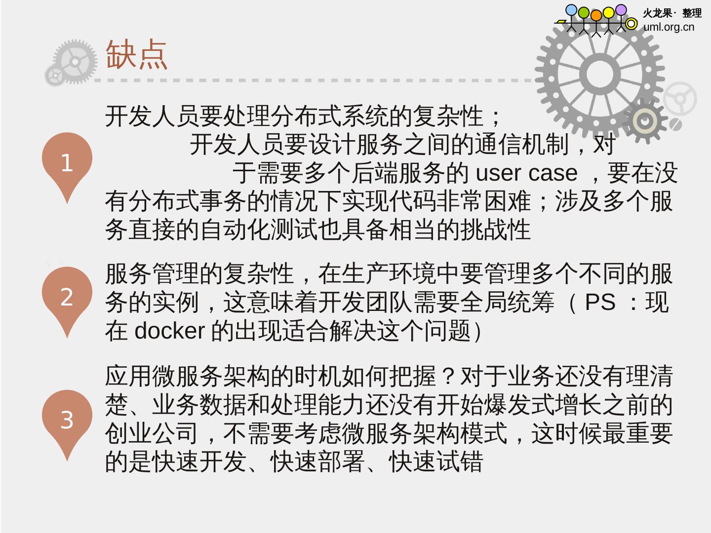 27 .缺点 1 开发人员要处理分布式系统的复杂性 ; 开发 人员要设计服务之间的通信机制, 对 于 需要多个后端服务的 user case ,要在 没有分布式 事务的情况下实现代码非常困难;涉及多个服务直接的自动化测试也具备相当的挑战性 服务管理的复杂性,在生产环境中要管理多个不同的服务的实例,这意味着开发团队需要全局统筹( PS :现在 docker 的出现适合解决这个问题) 2 应用微服务架构的时机如何把握?对于业务还没有理清楚、业务数据和处理能力还没有开始爆发式增长之前的创业公司,不需要考虑微服务架构模式,这时候最重要的是快速开发、快速部署、快速试错 3
