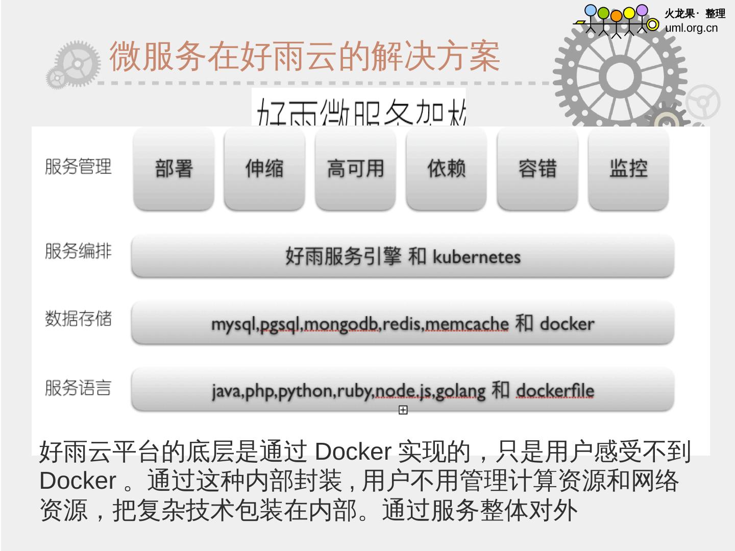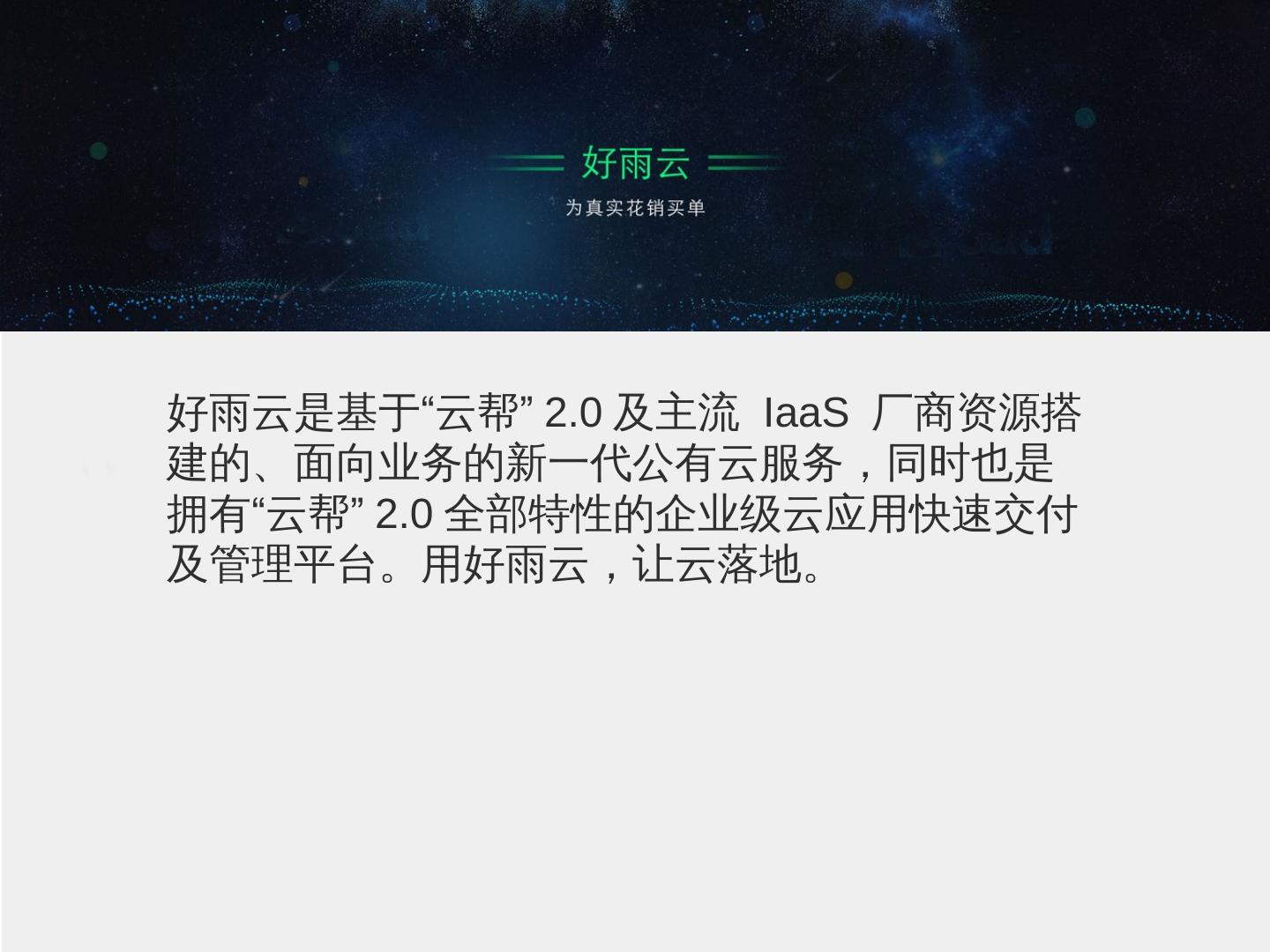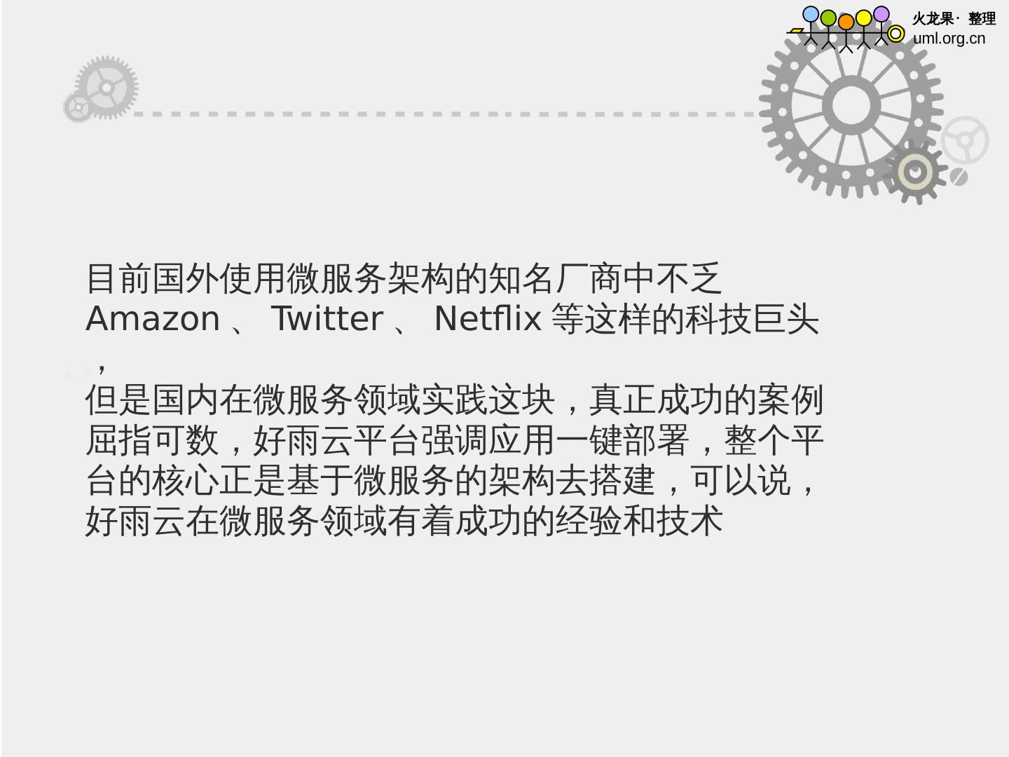 29 .目前国外使用微服务架构的知名厂商中 不乏 Amazon 、 Twitter 、 Netflix 等这样的科技巨头 , 但是 国内在微服务领域实践这块,真正成功的案例屈指可数,好雨云平台强调应用一键部署,整个平台的核心正是基于微服务的架构去搭建,可以说,好雨云在微服务领域有着成功的经验和技术