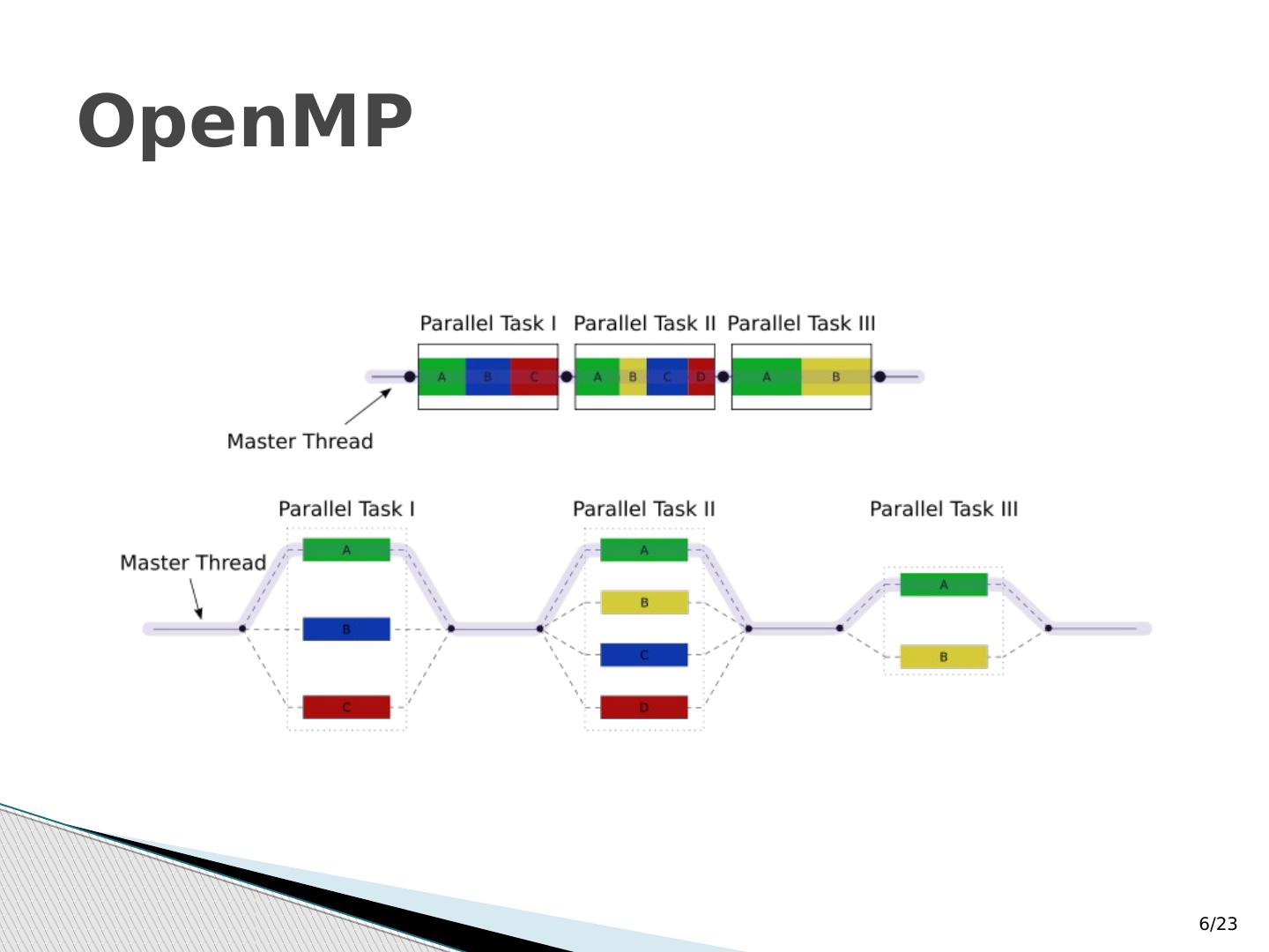 5 .an API C, C++, and Fortran OpenMP is managed by the nonprofit technology consortium OpenMP Architecture Review Board ( OpenMP ARB) AMD, IBM, Intel, Cray, HP, Fujitsu, Nvidia , NEC, Microsoft, Texas Instruments, Oracle Corporation, and more OpenMP uses a portable, scalable model simple and flexible interface standard desktop computer to the supercomputer OpenMP 5 /23