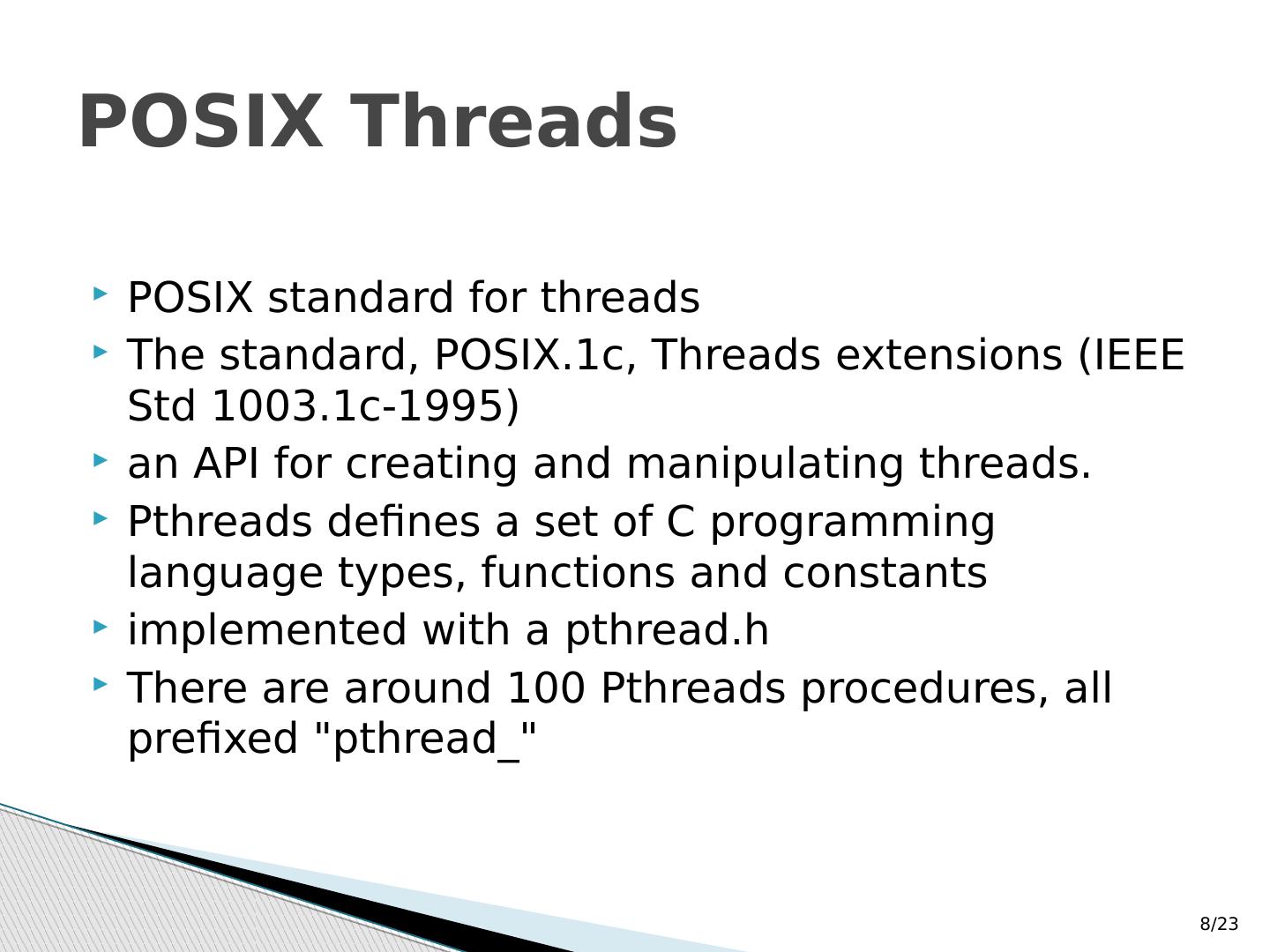 8 .POSIX standard for threads The standard, POSIX.1c, Threads extensions (IEEE Std 1003.1c-1995 ) an API for creating and manipulating threads . Pthreads defines a set of C programming language types, functions and constants implemented with a pthread.h There are around 100 Pthreads procedures, all prefixed " pthread _" POSIX Threads 8 /23