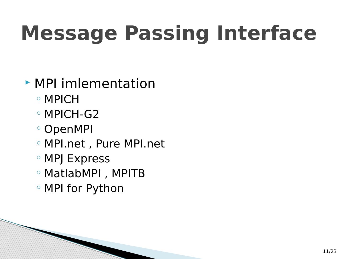 11 .MPI imlementation MPICH MPICH-G2 OpenMPI MPI.net , Pure MPI.net MPJ Express MatlabMPI , MPITB MPI for Python Message Passing Interface 11 /23