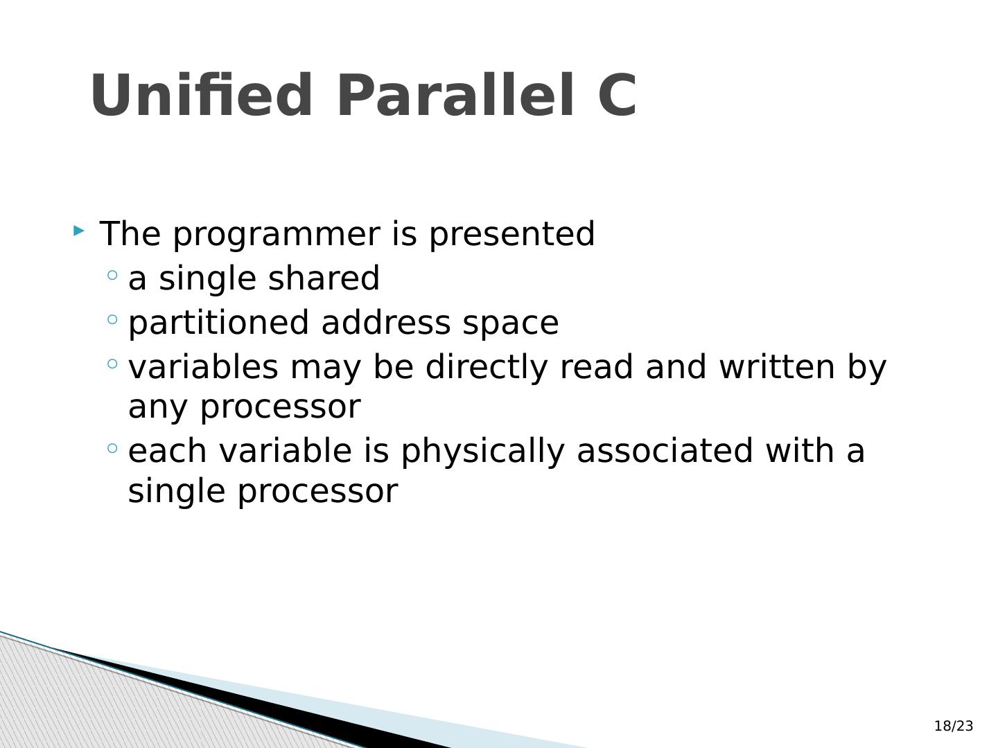 18 .The programmer is presented a single shared partitioned address space variables may be directly read and written by any processor each variable is physically associated with a single processor Unified Parallel C 18 /23