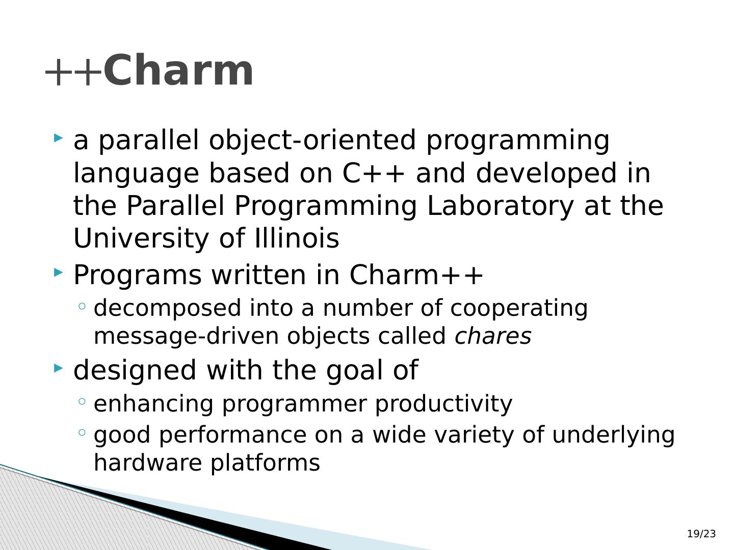 19 .a parallel object-oriented programming language based on C++ and developed in the Parallel Programming Laboratory at the University of Illinois Programs written in Charm ++ decomposed into a number of cooperating message-driven objects called chares designed with the goal of enhancing programmer productivity good performance on a wide variety of underlying hardware platforms Charm++ 19 /23
