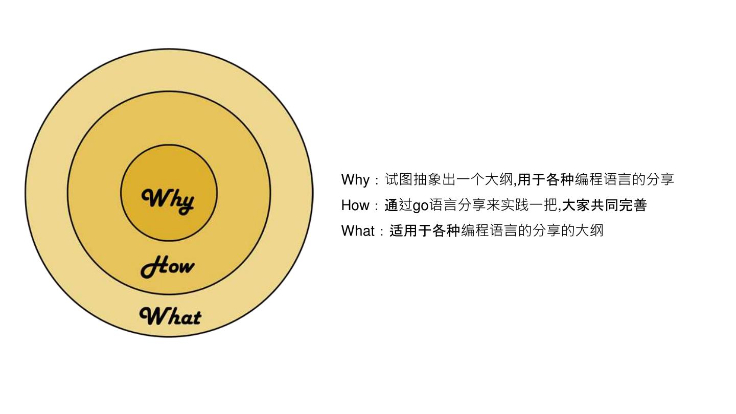 2 .Why:试图抽象出一个大纲,用于各种编程语言的分享 How:通过go语言分享来实践一把,大家共同完善 What:适用于各种编程语言的分享的大纲