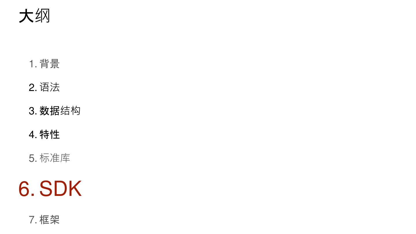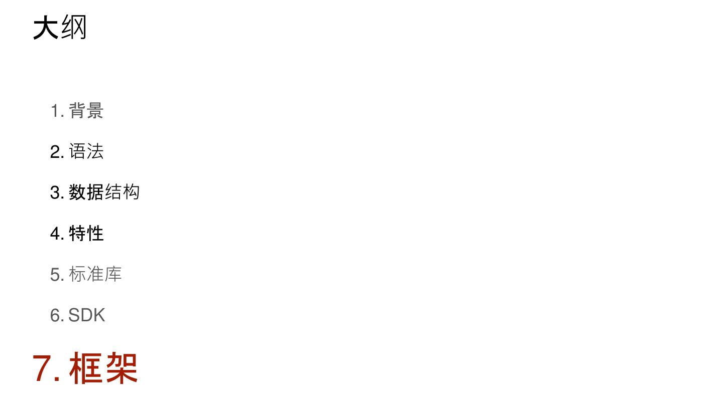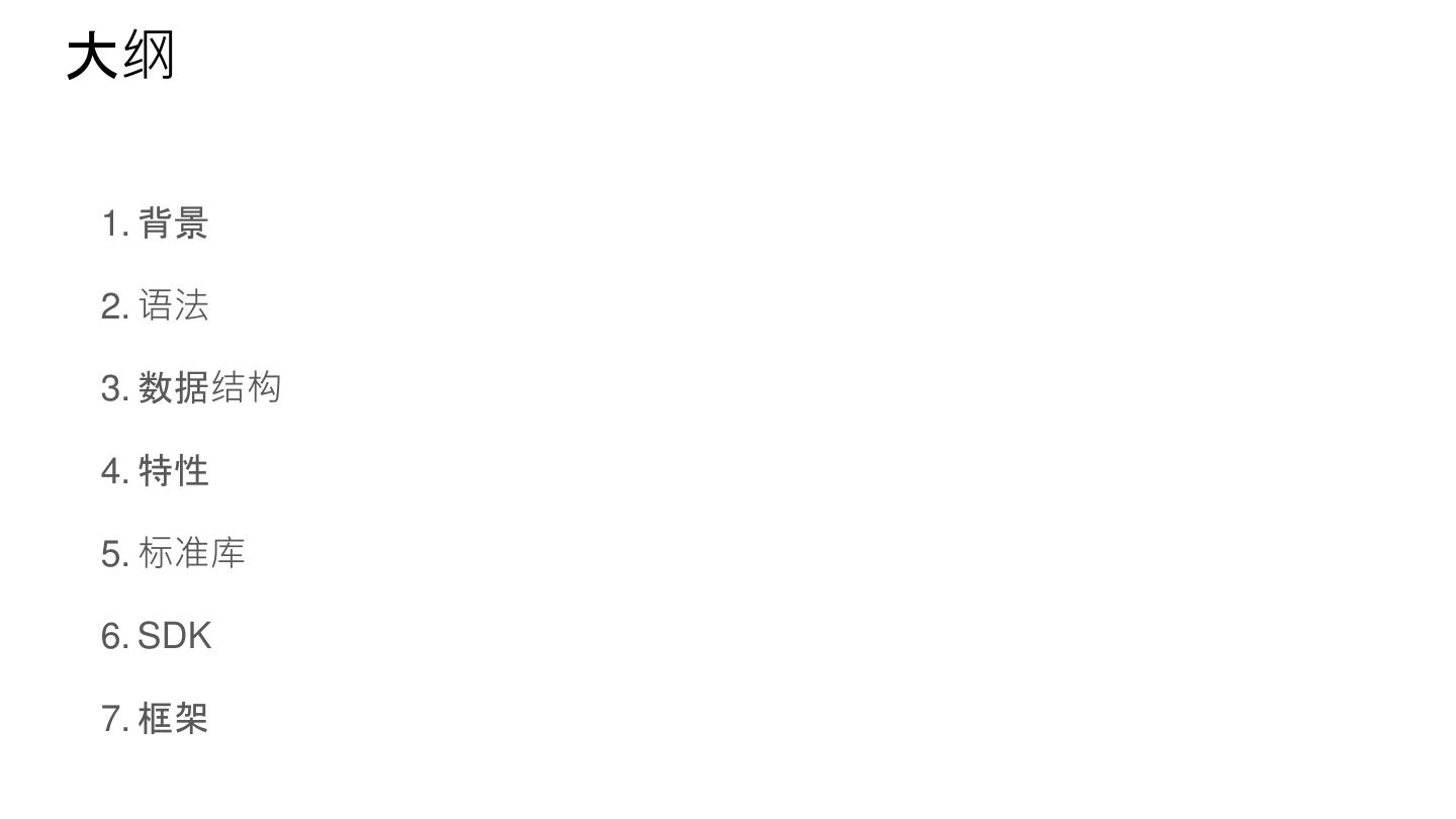 11 .大纲 1. 背景 2. 语法 3. 数据结构 4. 特性 5. 标准库 6. SDK 7. 框架