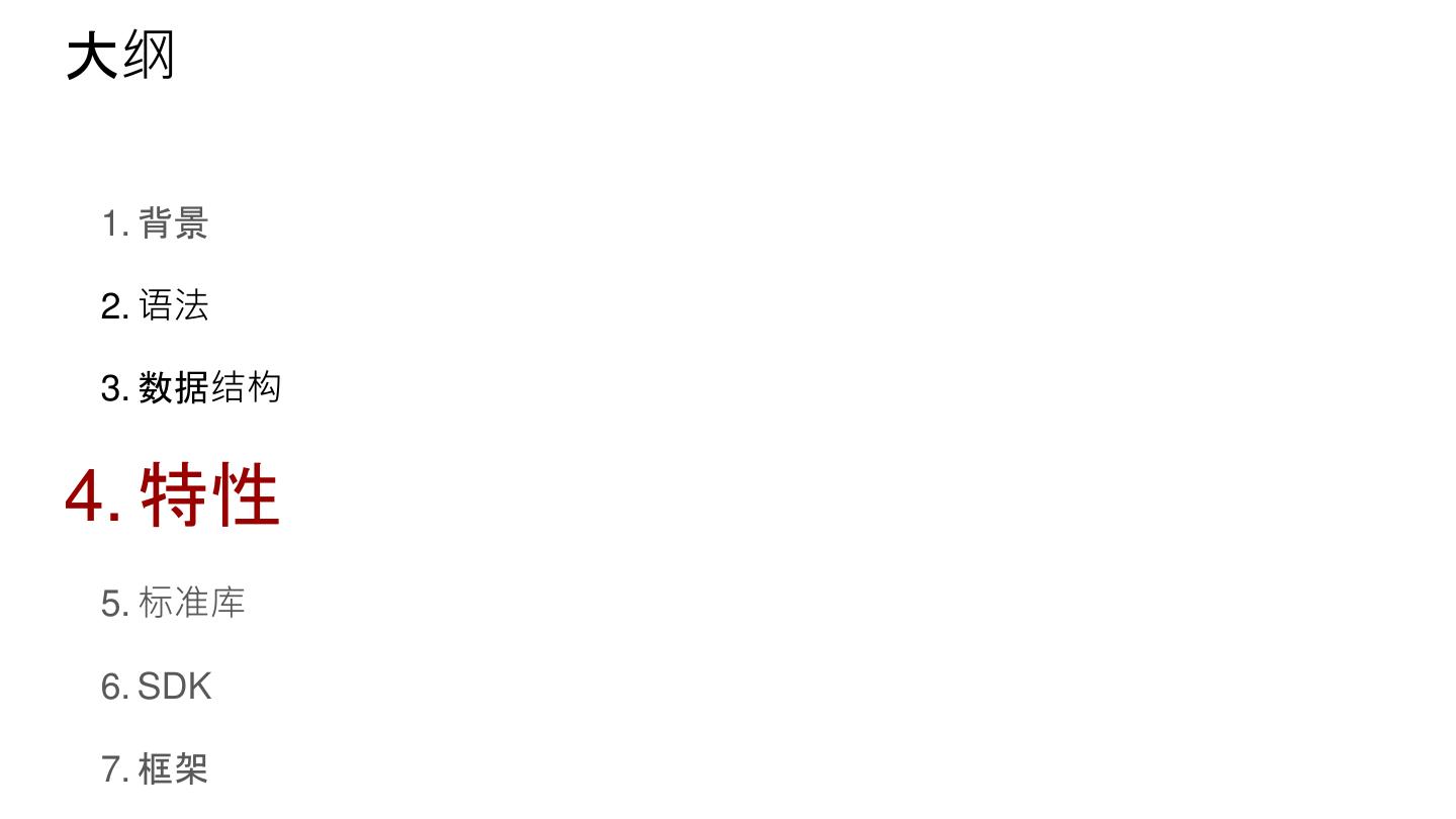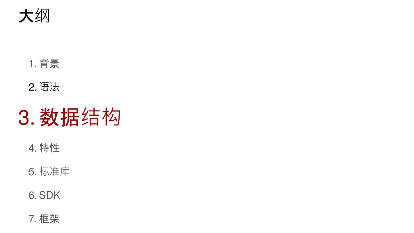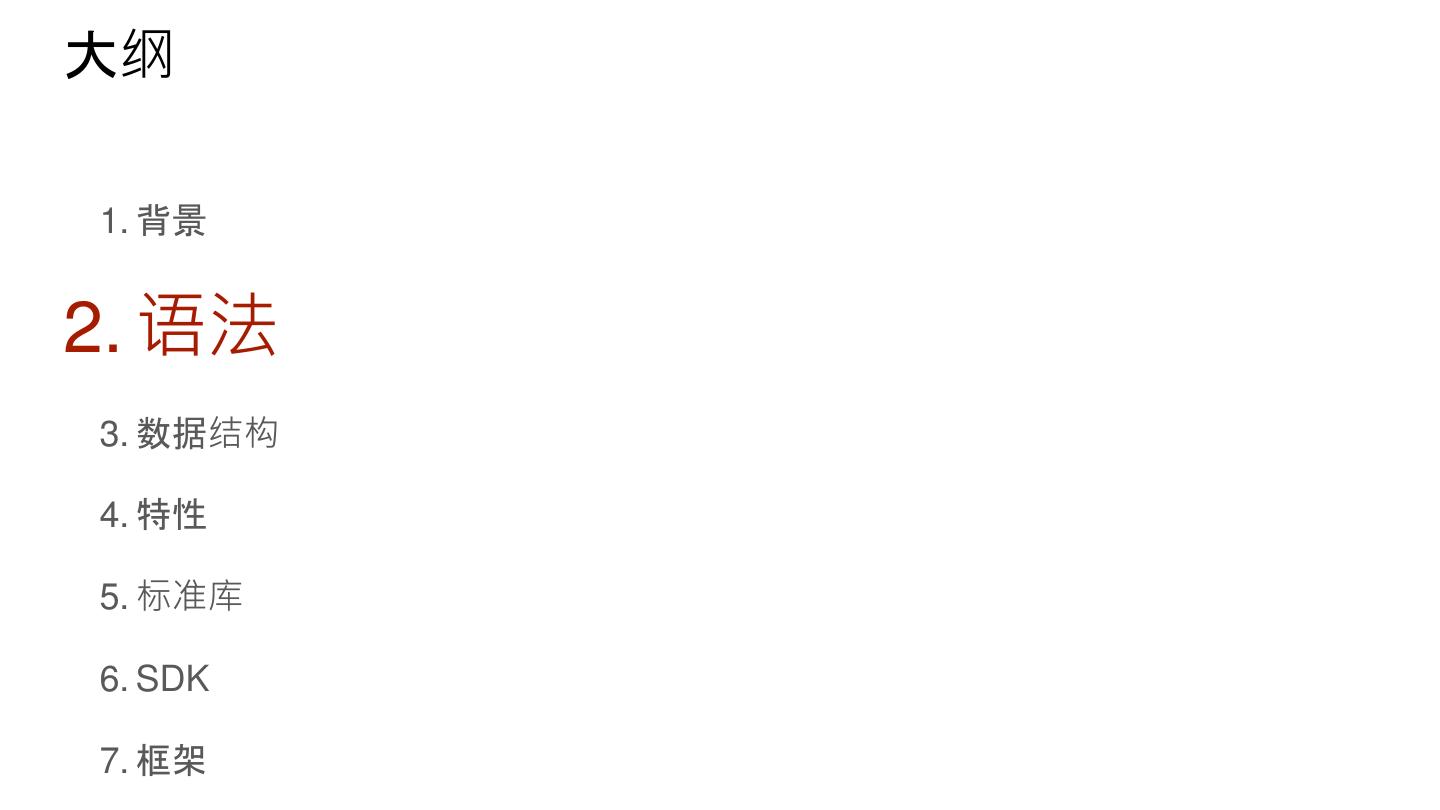 3 .大纲 1. 背景 2. 语法 3. 数据结构 4. 特性 5. 标准库 6. SDK 7. 框架